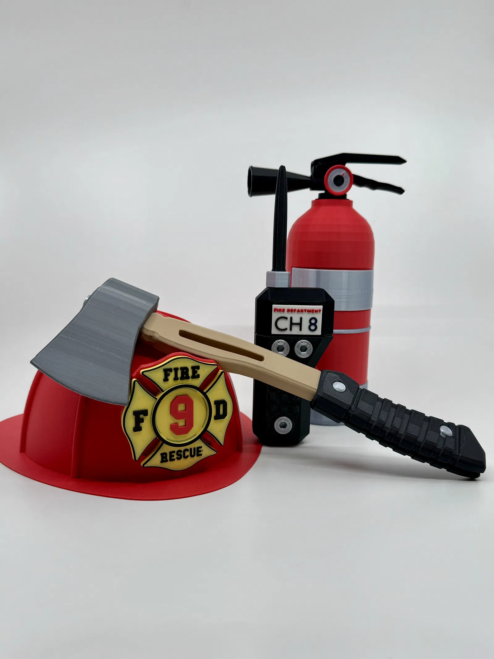 Bộ đồ chơi nhập vai lính cứu hỏa gồm Mũ bảo hiểm, Rìu, Bộ đàm và Bình chữa cháy được thiết kế an toàn cho bé. Sản phẩm cần sử dụng thêm keo dán để lắp ráp, hỗ trợ in bằng nhựa PLA và TPU để mô hình thêm phần sinh động và bền bỉ.
