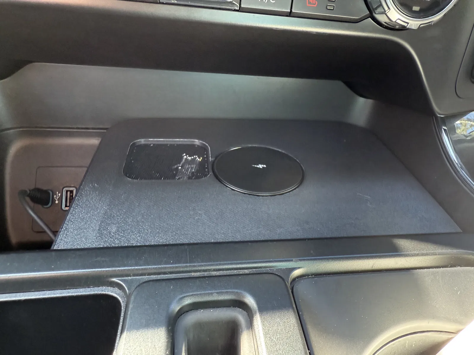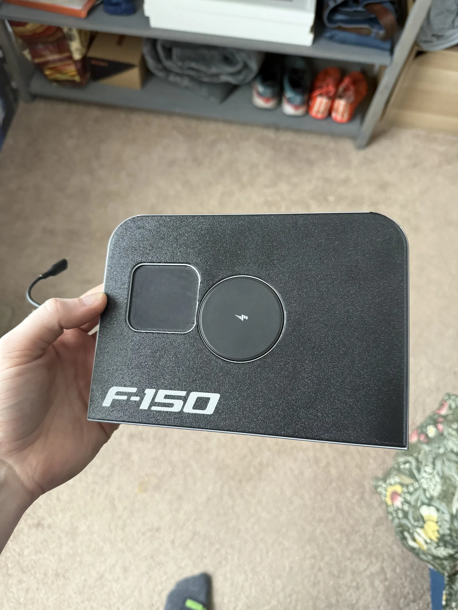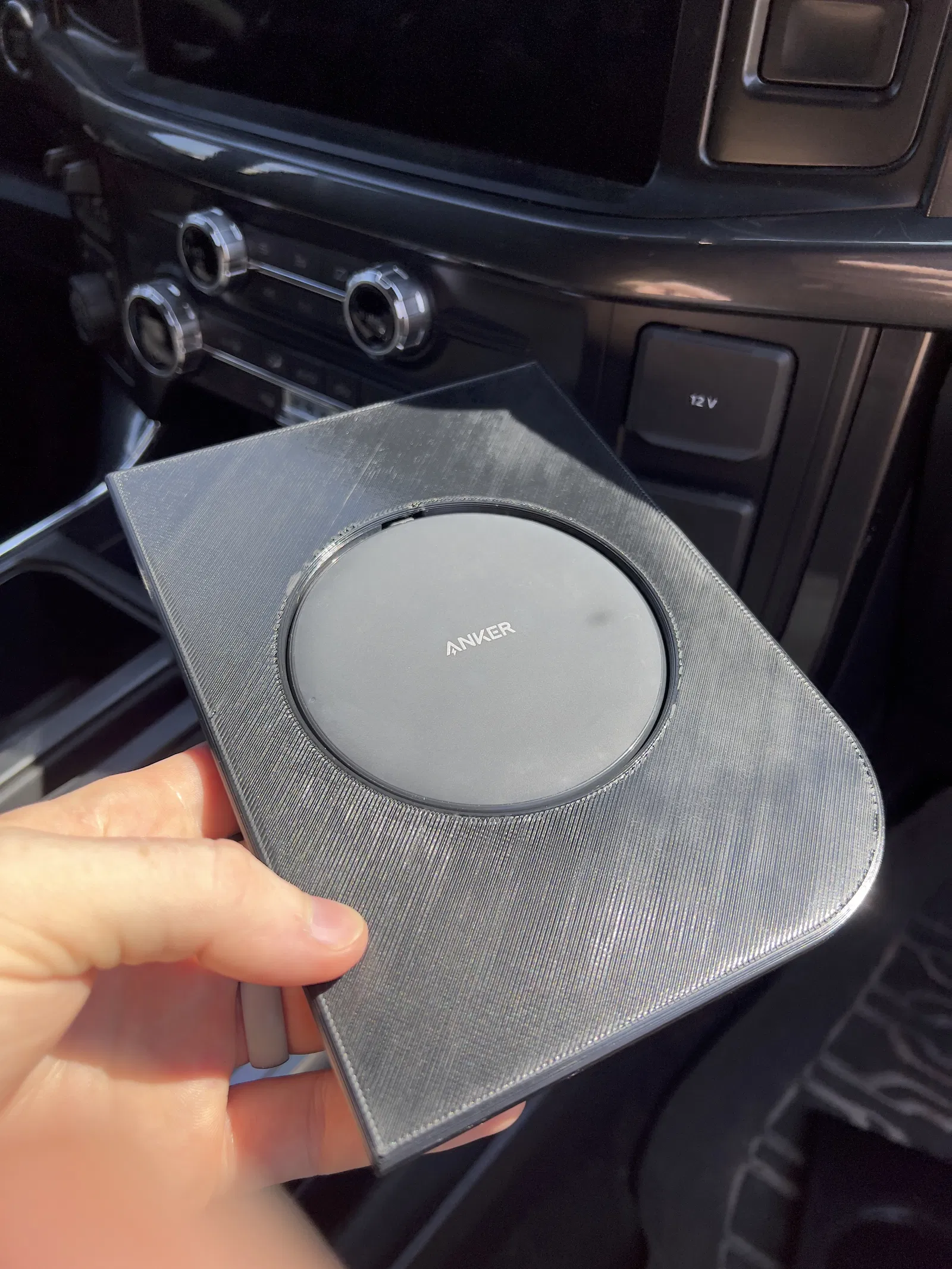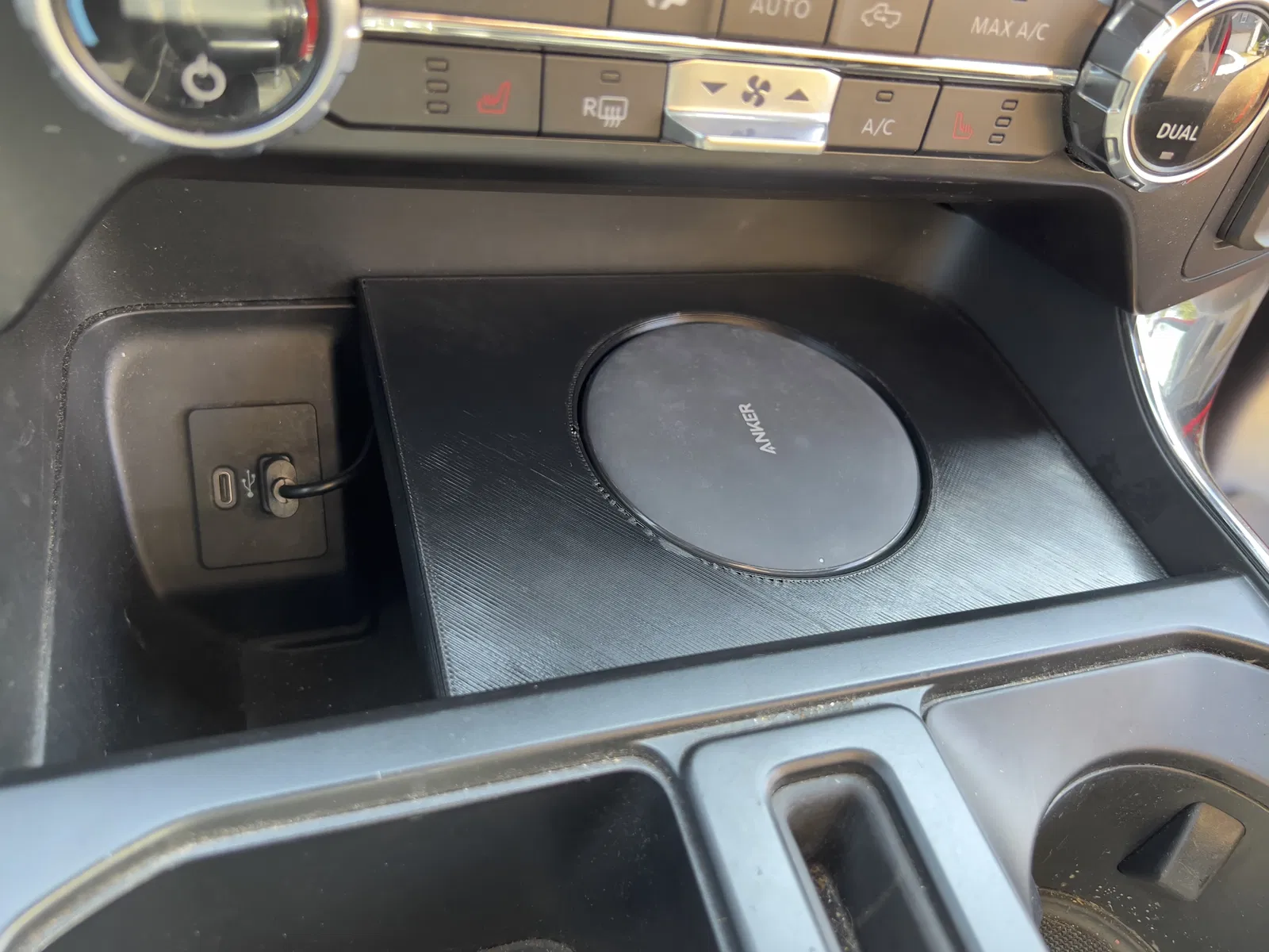 Chiếc F150 XLT của mình không được trang bị sạc không dây từ nhà máy, và nó lại có một khoảng trống khá lớn ở bảng điều khiển ngay bên dưới màn hình giải trí. Mình đã thiết kế phụ kiện này để đặt vừa vặn trên gờ của hộc đó nhằm giữ một bộ sạc không dây phổ thông. Mình đã dùng nó trên xe gần một năm nay và thực sự rất ưng ý!