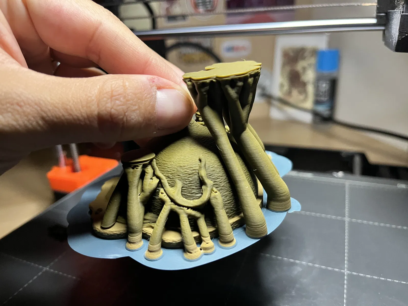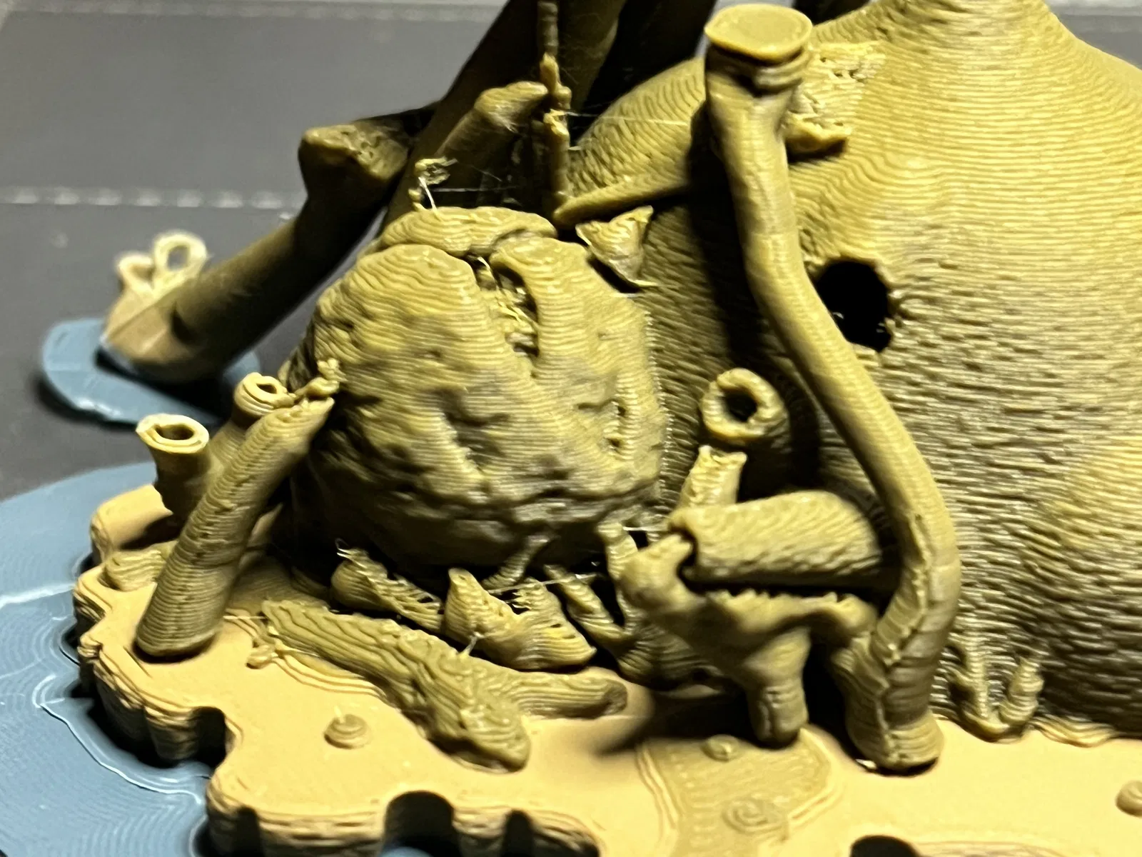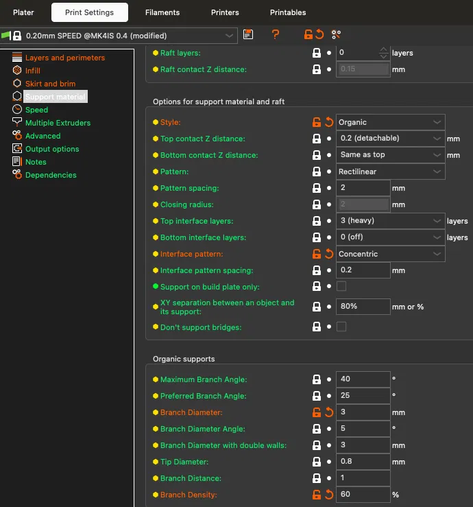 Sử dụng Tree Supports BẮT BUỘC, chúng là một phần không thể thiếu của mô hình. Việc kết hợp các hỗ trợ ngẫu nhiên, hữu cơ này nhằm mô phỏng những dây leo và cây cối trong rừng rậm. Bạn có thể tùy chỉnh thông số organic support (như đường kính) để đạt hiệu quả như ý. Nếu đổi tỉ lệ in, nhớ điều chỉnh cả cài đặt hỗ trợ.
