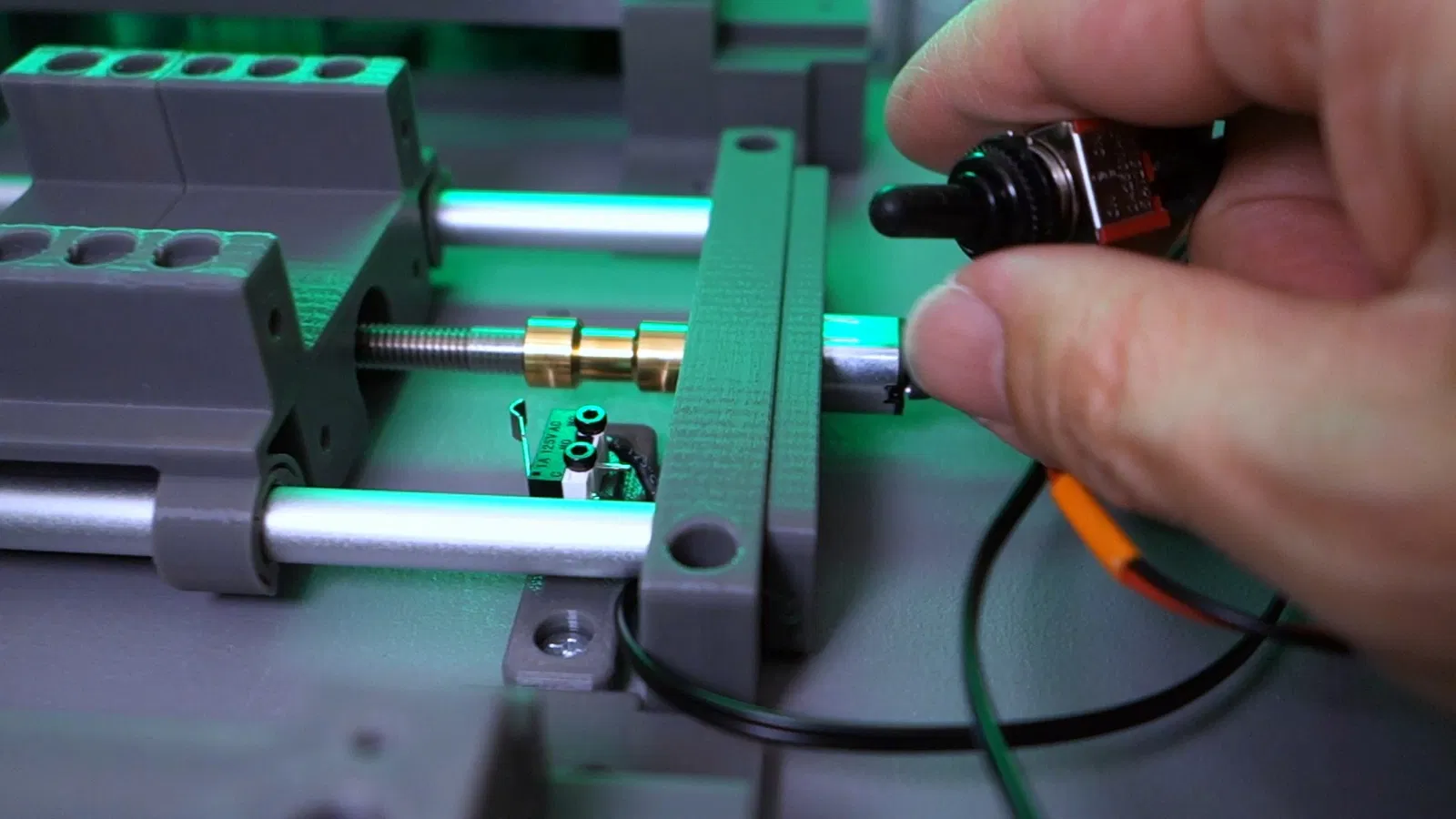 Tham khảo cách đi dây: Mình dùng công tắc gạt để đảo chiều quay và gắn microswitch ở giữa.