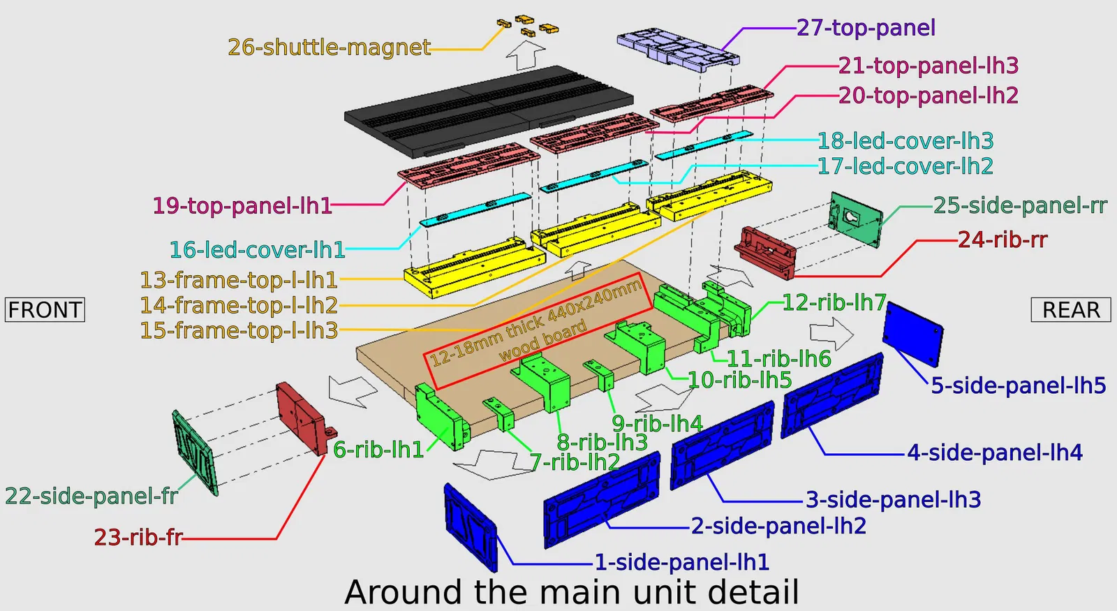 Các loại ốc vít cần thiết để lắp ráp: ・Ốc lục giác M2x5-12 cho các chi tiết 19, 20, 21, 27. ・Ốc lục giác M2x12-15 để gắn chi tiết 27 và microswitch. ・Các chi tiết còn lại dùng ốc lục giác M3x5. ・Với bảng gỗ, hãy dùng ốc vít tự khoan đầu bằng M3x12. ・Nếu ốc bị lỏng, bạn hãy thử dùng loại dài hơn nhé.