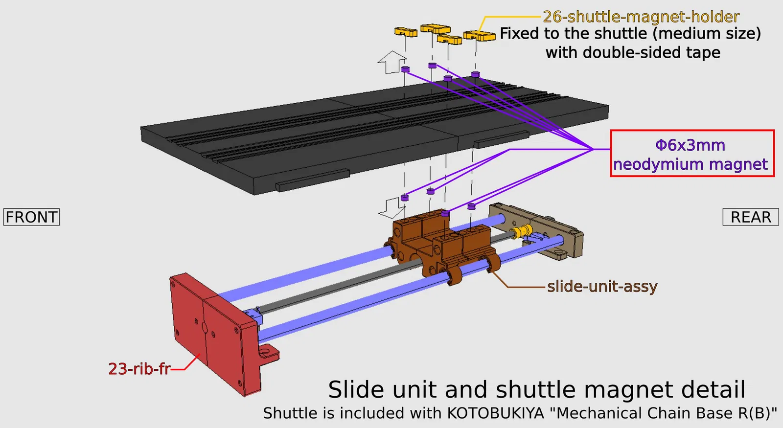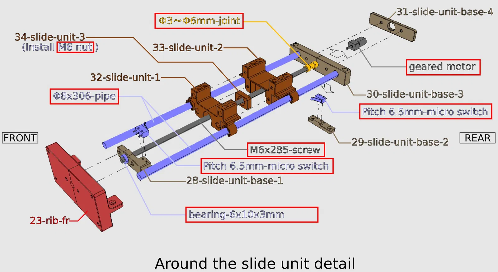 Bộ phận trượt (Slide unit) ・Nam châm vĩnh cửu Φ6x3mm x8 ・Ống Φ8x306mm x2 ・Đai ốc M6 x1 ・Vòng bi 6x10x3mm x1 ・Thanh ren M6x285mm x1 ・Khớp nối Φ3 đến Φ6mm x1 (https://aliexpress.com/item/1005002015620915.html) ・Động cơ giảm tốc (Geared motor) x1 (https://ja.aliexpress.com/item/33022320164.html)