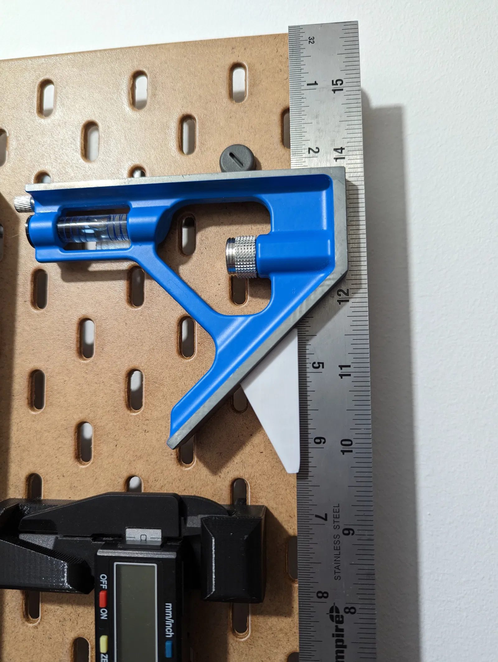 Nếu bác đang sở hữu một chiếc thước vuông kết hợp (combination square) và thấy việc để nó nằm bừa bãi trên bàn làm việc thật phiền phức, thì đây chính là món phụ kiện mà bác đang tìm kiếm. Mẫu giá treo này được thiết kế chuyên biệt để gắn trực tiếp lên bảng lỗ SKADIS phổ biến của IKEA, giúp không gian làm việc của bác trở nên gọn gàng, ngăn nắp và chuyên nghiệp hơn hẳn.