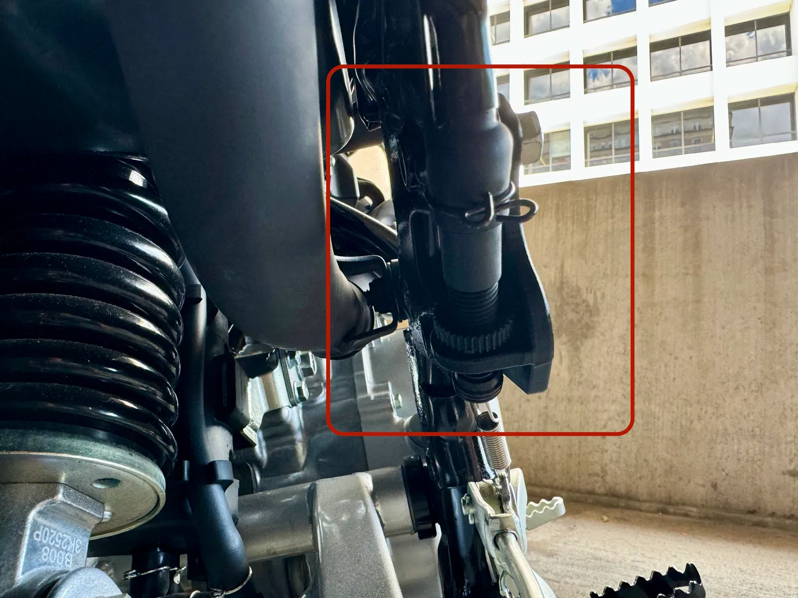 Gác chân sau bên phải trên dòng xe Honda XR150L 2024 được thiết kế tích hợp sẵn công tắc kích hoạt đèn phanh sau dạng piston. Điều này khiến anh em không thể tháo gỡ gác chân để giảm trọng lượng hoặc làm cho xe gọn gàng hơn.