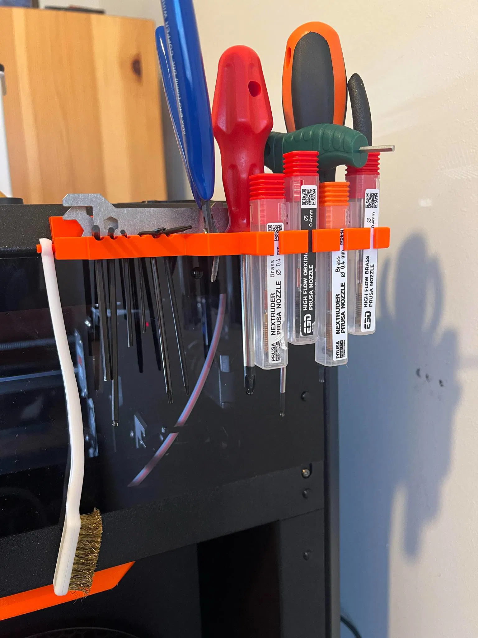 Giá đỡ dụng cụ tiện lợi gắn nam châm vào hông máy in Prusa Core One. Thiết kế hỗ trợ chứa đầy đủ bộ dụng cụ đi kèm và bốn đầu nozzle. Hiện đã có sẵn hai phiên bản V1 và V2 với kích thước nam châm và không gian lưu trữ cải tiến.
