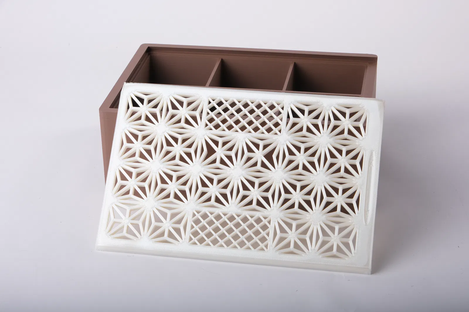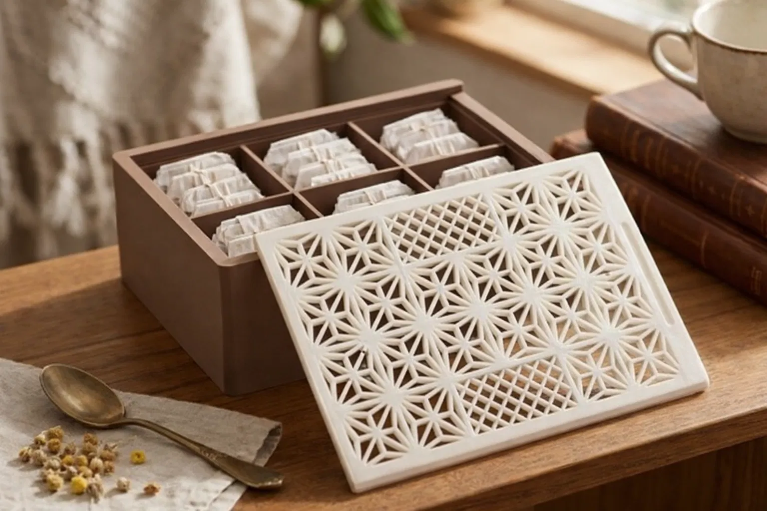 Đây là mẫu hộp đựng trà đơn giản, tiện dụng nhưng vẫn mang nét tinh tế ở phần nắp. Phần đế được chia làm bốn ngăn, giúp bạn dễ dàng phân loại các loại trà túi lọc hoặc các vật dụng nhỏ một cách ngăn nắp. Điểm nhấn nổi bật chính là phần nắp với họa tiết lưới hình học chi tiết, khớp vừa vặn với khung hộp. Thiết kế này mang phong cách hiện đại, gọn gàng, rất hợp để đặt trên mặt bàn bếp hoặc kệ tủ. Với các góc được bo tròn, chiếc hộp tạo cảm giác mềm mại hơn so với những chiếc hộp vuông thông thường. Đây là một mẫu in khá đơn giản và sẽ rất đẹp nếu bạn phối hai màu tương phản, như màu nâu và trắng như trong ảnh.