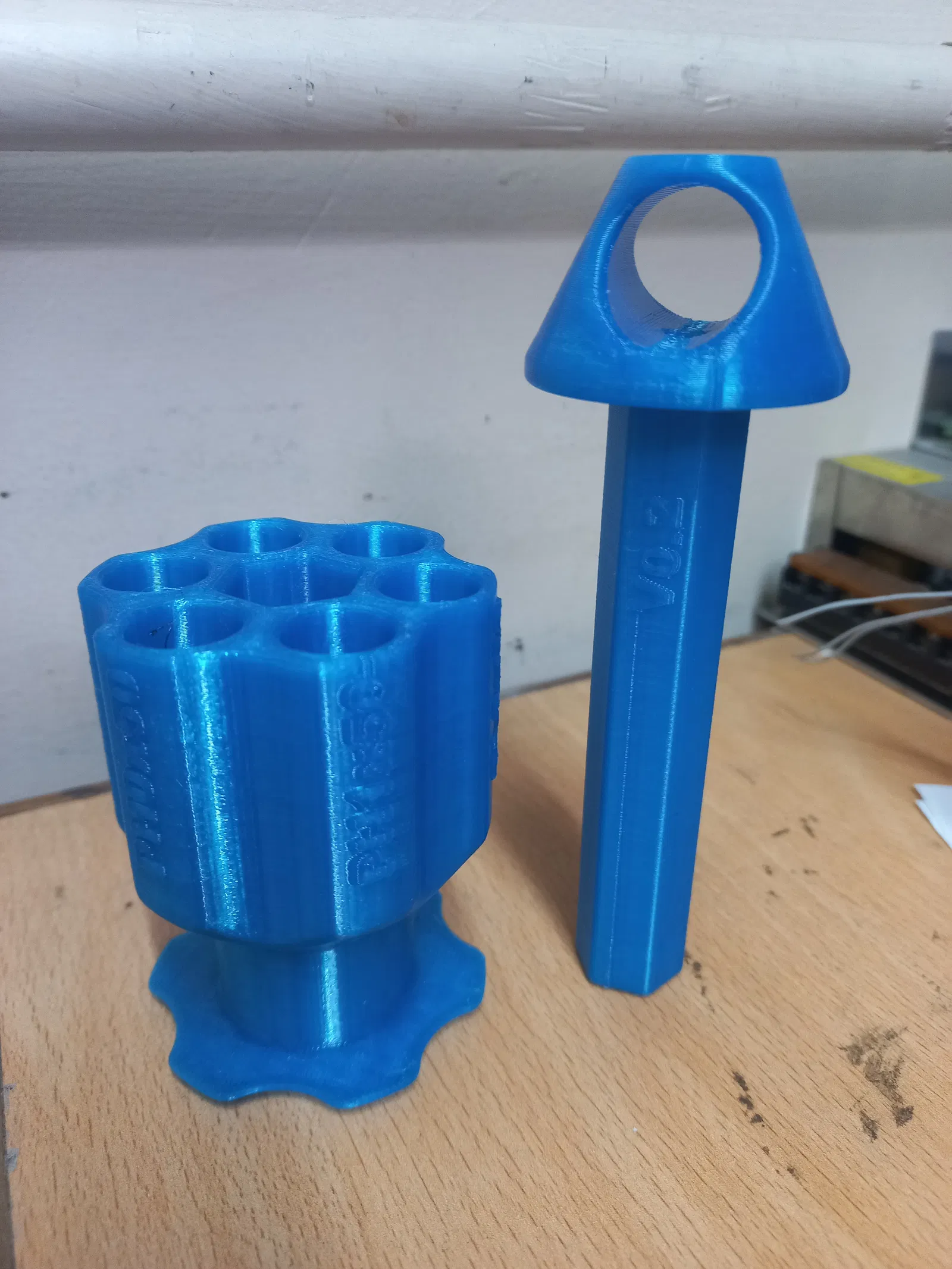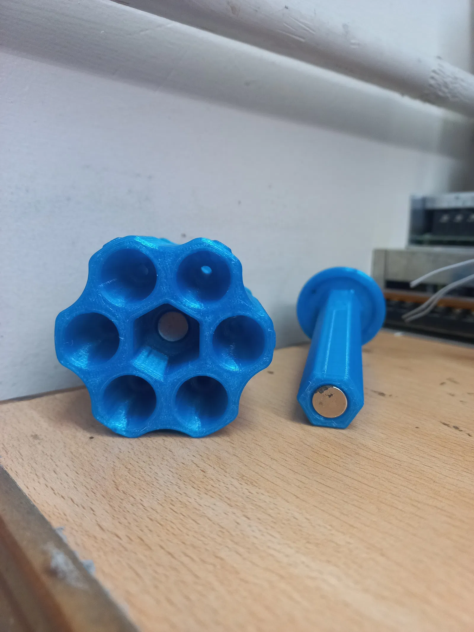 Cái đế này sử dụng hai (2) viên nam châm neodymium (hình trụ D10xH10mm) để giữ mỗi chiếc tua vít ở vị trí cố định. Mình tận dụng mấy viên nam châm cũ có sẵn, và mình khuyên các bạn nên dùng loại có cấp độ N30 hoặc thấp hơn – như vậy sẽ giúp việc lấy tua vít ra dễ dàng hơn khi cần mà vẫn đảm bảo độ bám dính.