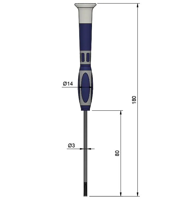 Thiết kế này dành riêng cho bộ tua vít chính xác Bremen (hoặc các thương hiệu có kiểu dáng tương đương). Như hình vẽ kỹ thuật, các lỗ cắm phù hợp với tay cầm đường kính khoảng Ø14mm và thân Ø3mm, tổng chiều dài 180mm (thân dài 80mm). Nếu bộ tua vít của bạn có cùng kích thước, chiếc đế này sẽ vừa vặn hoàn hảo.