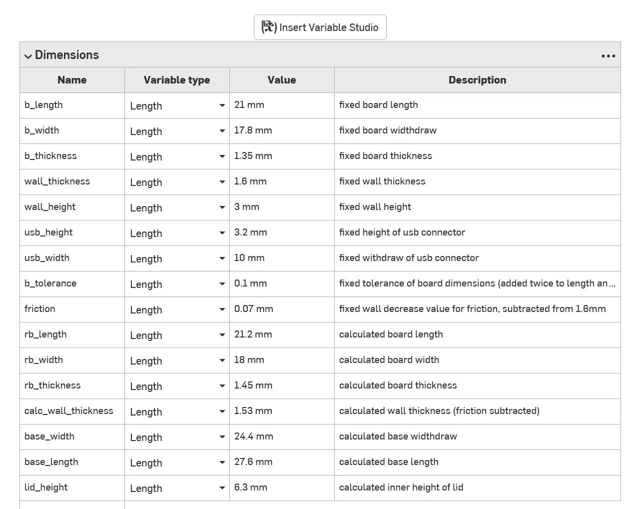 Nếu bạn cần kích thước khác, cứ thoải mái sử dụng Onshape (Link dự án tại đây: Project). Bạn chỉ cần thay đổi 3 biến đầu tiên trong tab kích thước (dimensions tab) để điều chỉnh cho các loại bo mạch khác. Đối với các kiểu vỏ và nắp khác nhau, hãy thay đổi cấu hình (configuration) nằm ở trên cùng của cây dự án. Nếu bạn không quen dùng Onshape mà lại cần kích thước khác, cứ nhắn tin riêng cho mình nhé.
