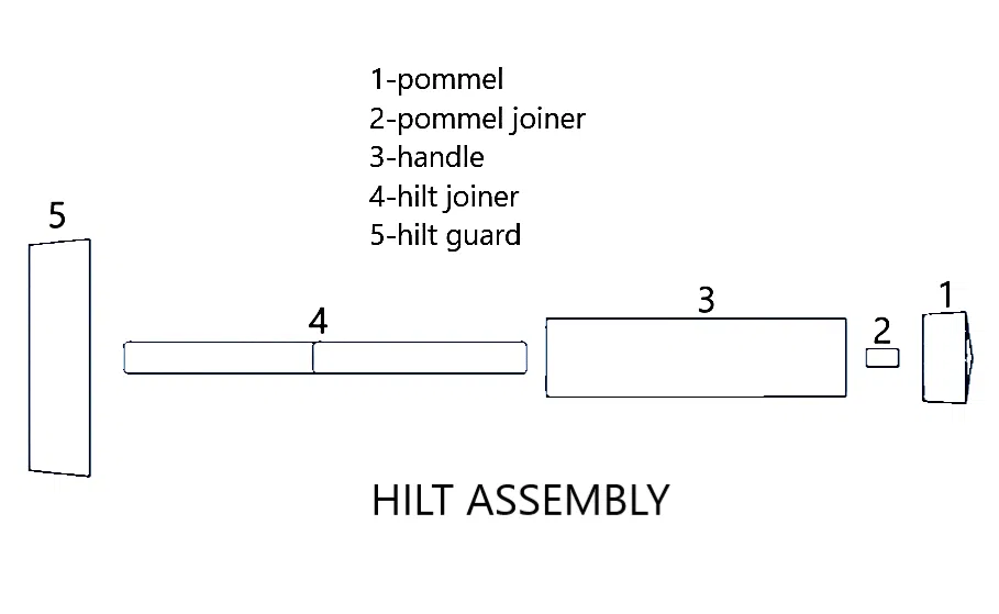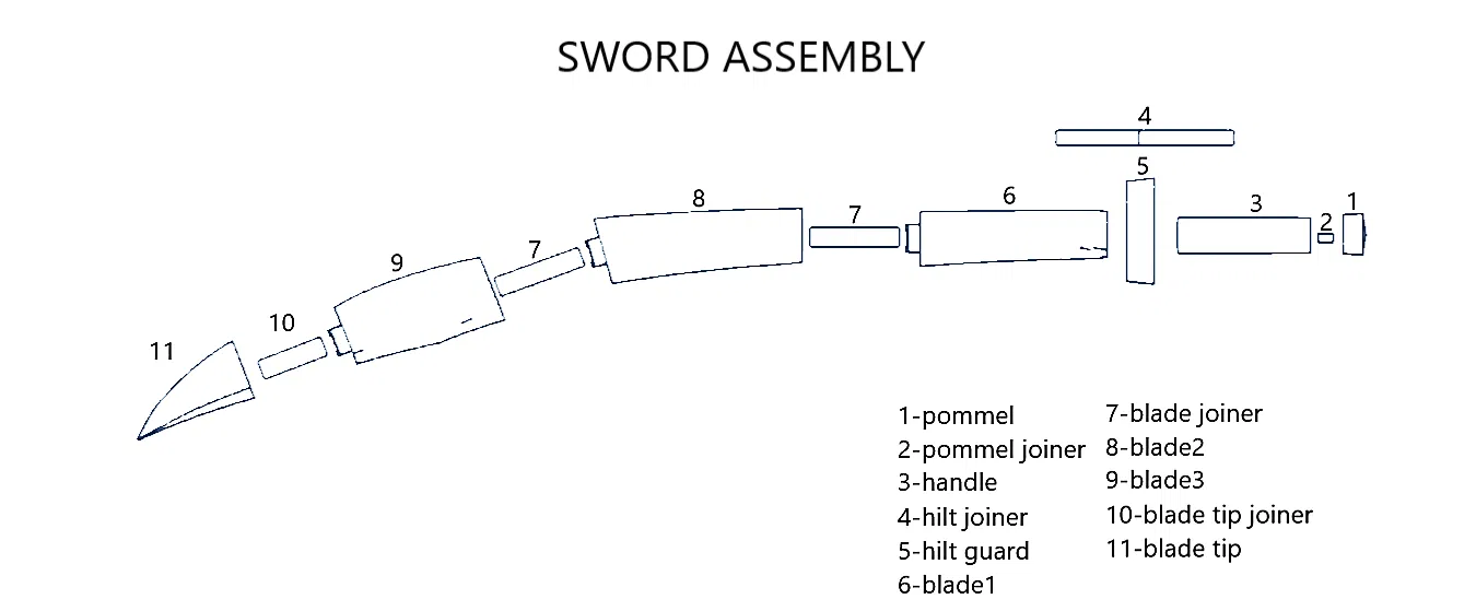 Mình đã đính kèm sơ đồ lắp ráp bung (exploded diagrams) để giúp việc lắp ráp dễ dàng hơn, nhìn chung thì khá đơn giản (bạn sẽ cần hai chiếc Blade_joiners). Mình đã chừa đủ khoảng trống ở phần tay cầm để bạn có thể quấn da mà các thanh kiếm vẫn khít lại với nhau. Về phần keo dán, mình dùng Superglue dạng gel.