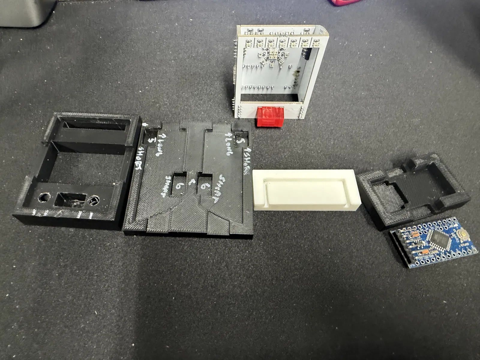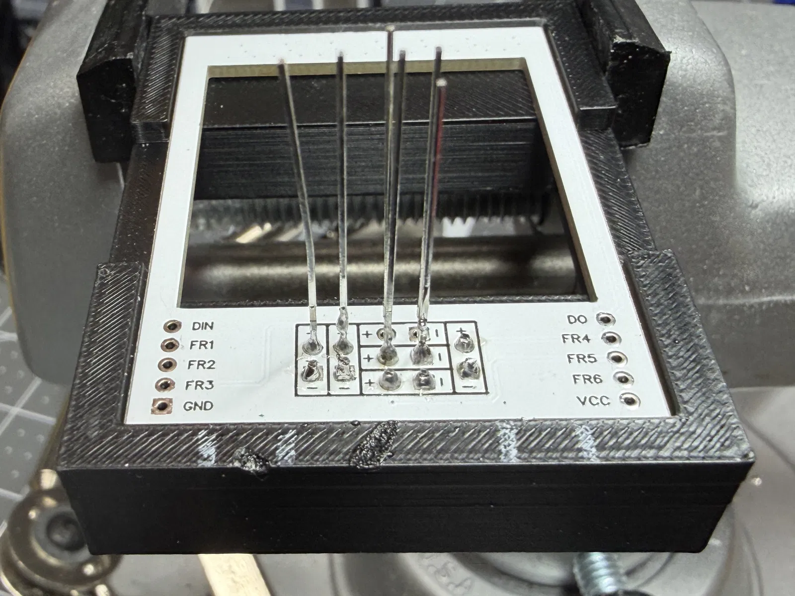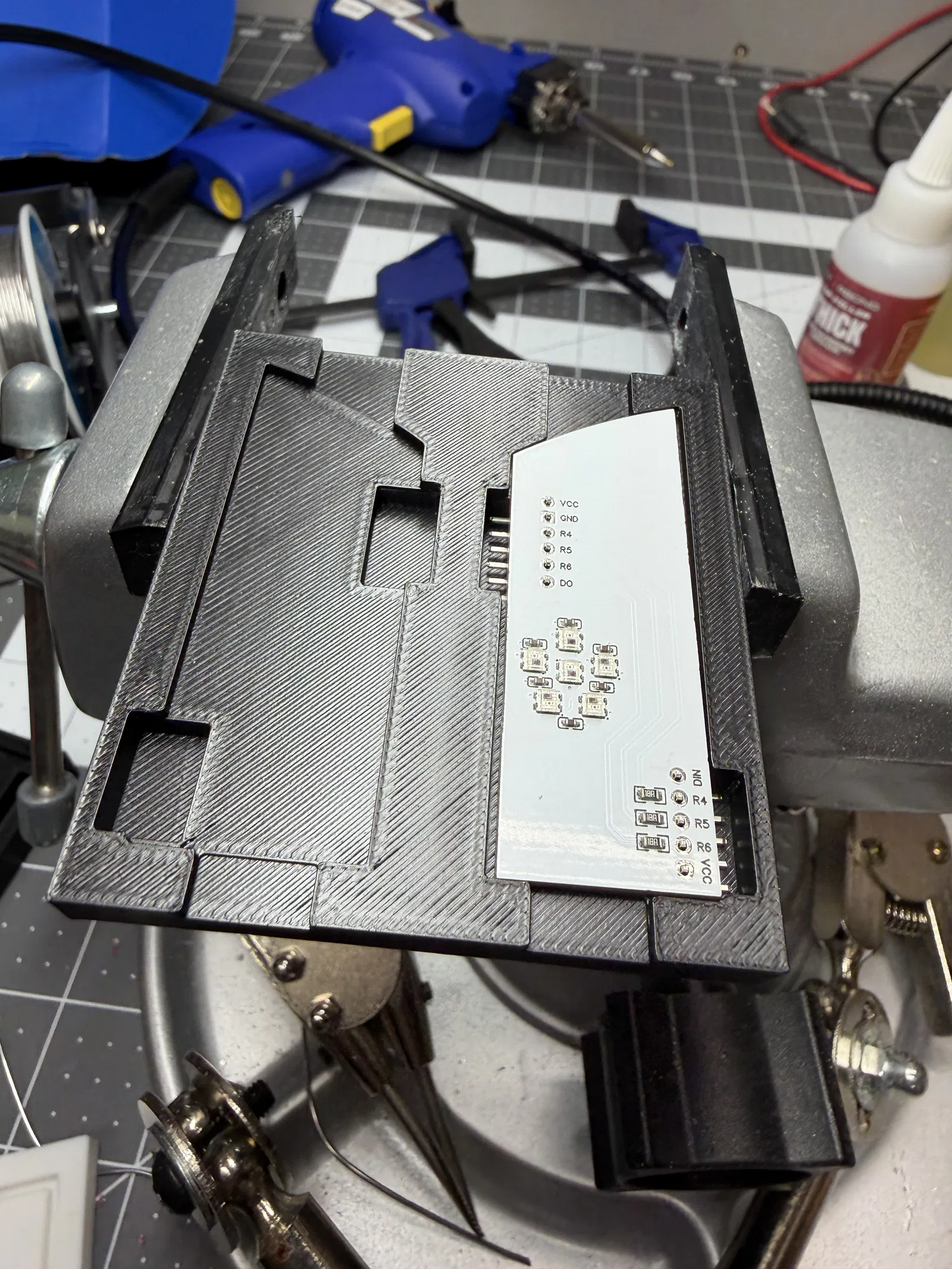 Bộ gá lắp giúp hỗ trợ quá trình hàn và lắp ráp các bộ mạch đèn periscope cho mô hình R2-D2. Thiết kế này giúp định vị linh kiện chính xác và dễ dàng thao tác.