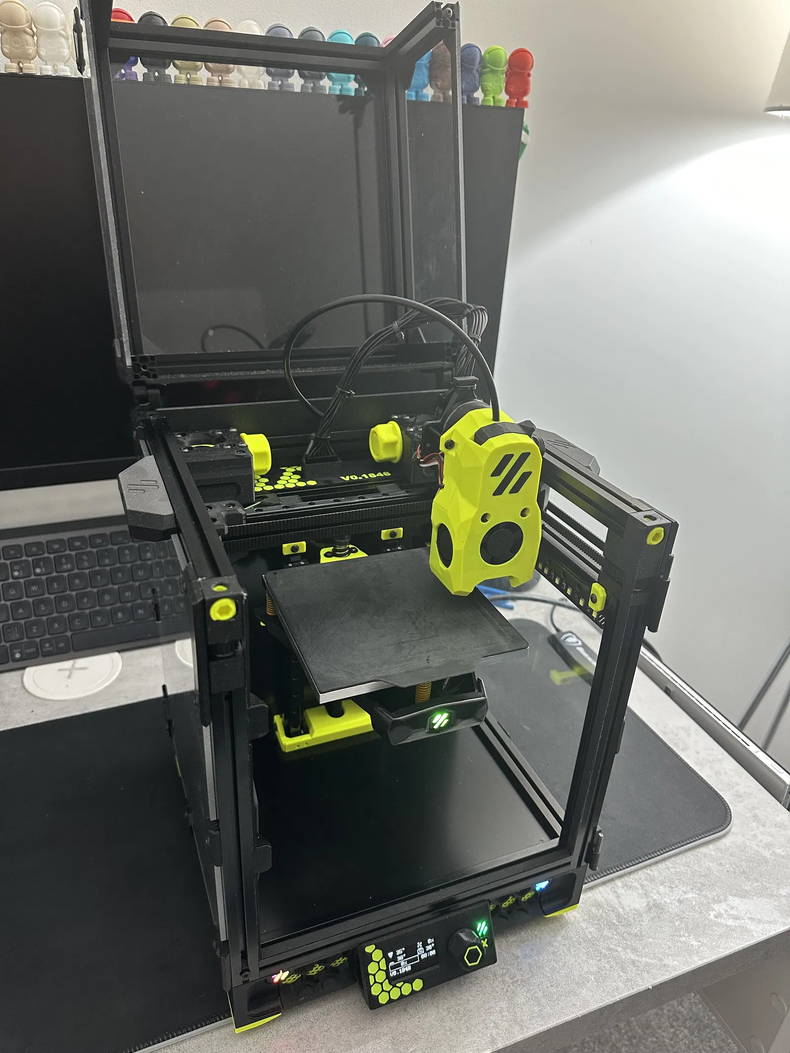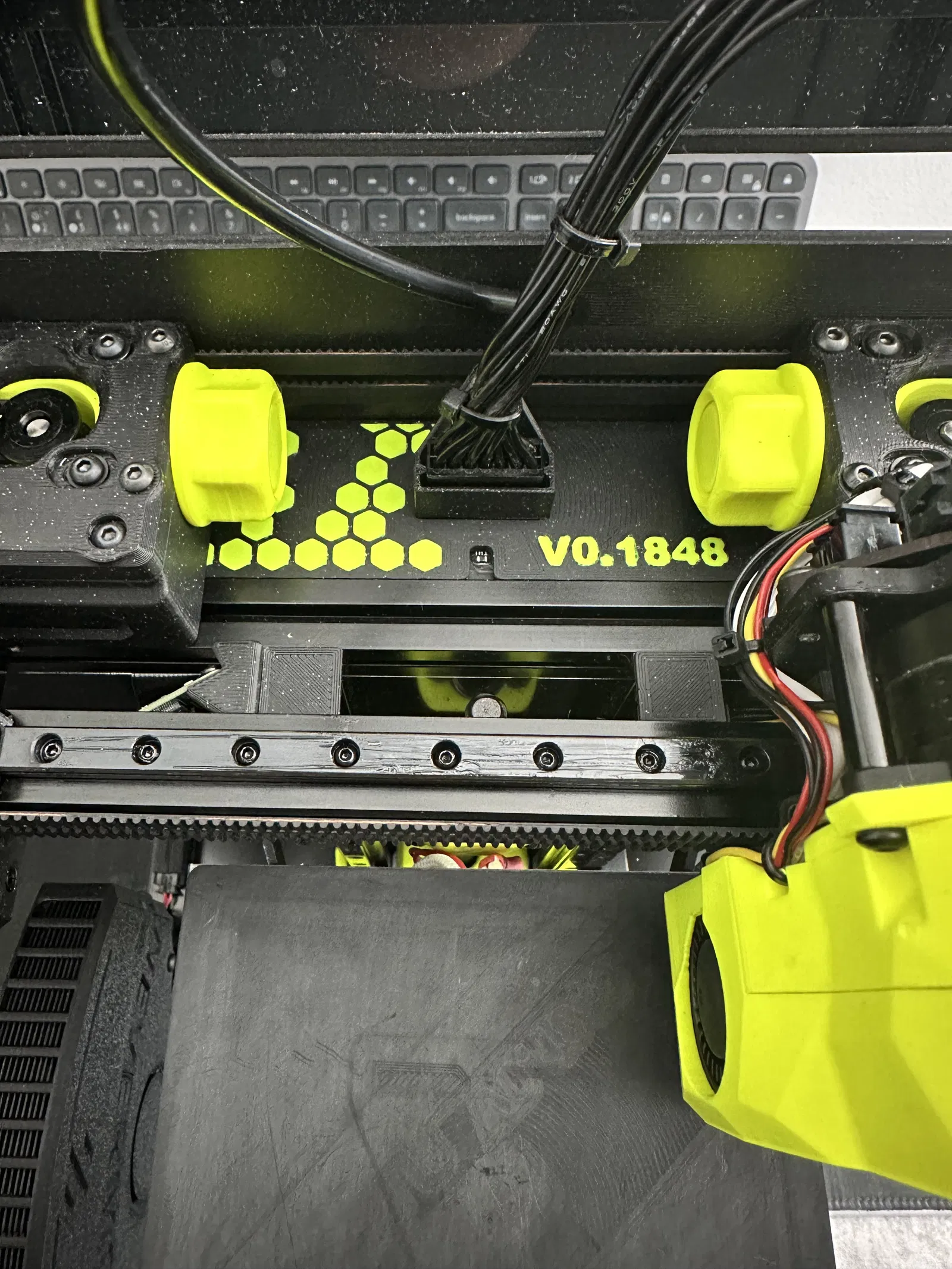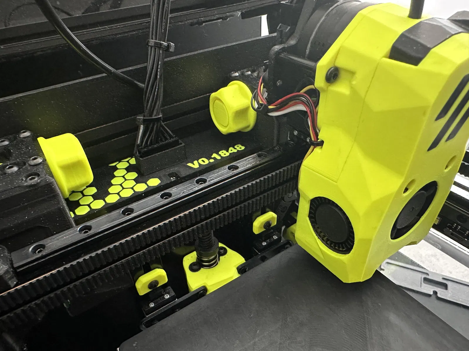 Vì V0.2 hiện đã dùng homing không cảm biến (sensorless), nên cái lỗ trên ngàm khung (frame mount) cũ khiến nhiệt độ trong buồng in bị thất thoát… Giờ thì không còn nữa nhờ thiết kế hình lục giác mới kèm theo số series!