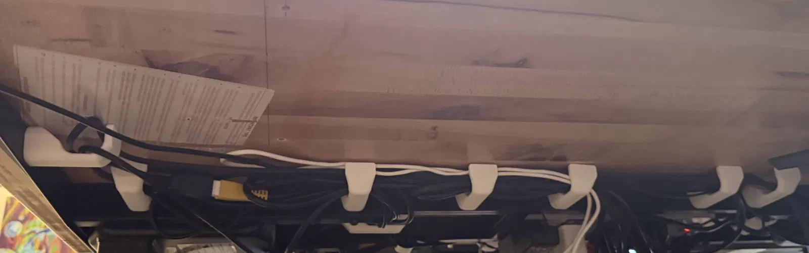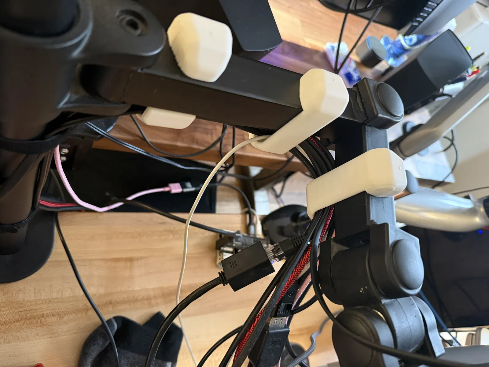 Mình đã thử dùng mấy cái 'arches' từ bản gốc, nhưng bàn của mình là gỗ nguyên khối gắn khung Uplift, nên mình muốn tận dụng luôn cái khung kim loại có sẵn, mà mấy cái arches đó lại không khớp lắm. Thế là mình tự thiết kế một cái kẹp dùng nam châm để giữ dây cáp, thấy ổn phết.