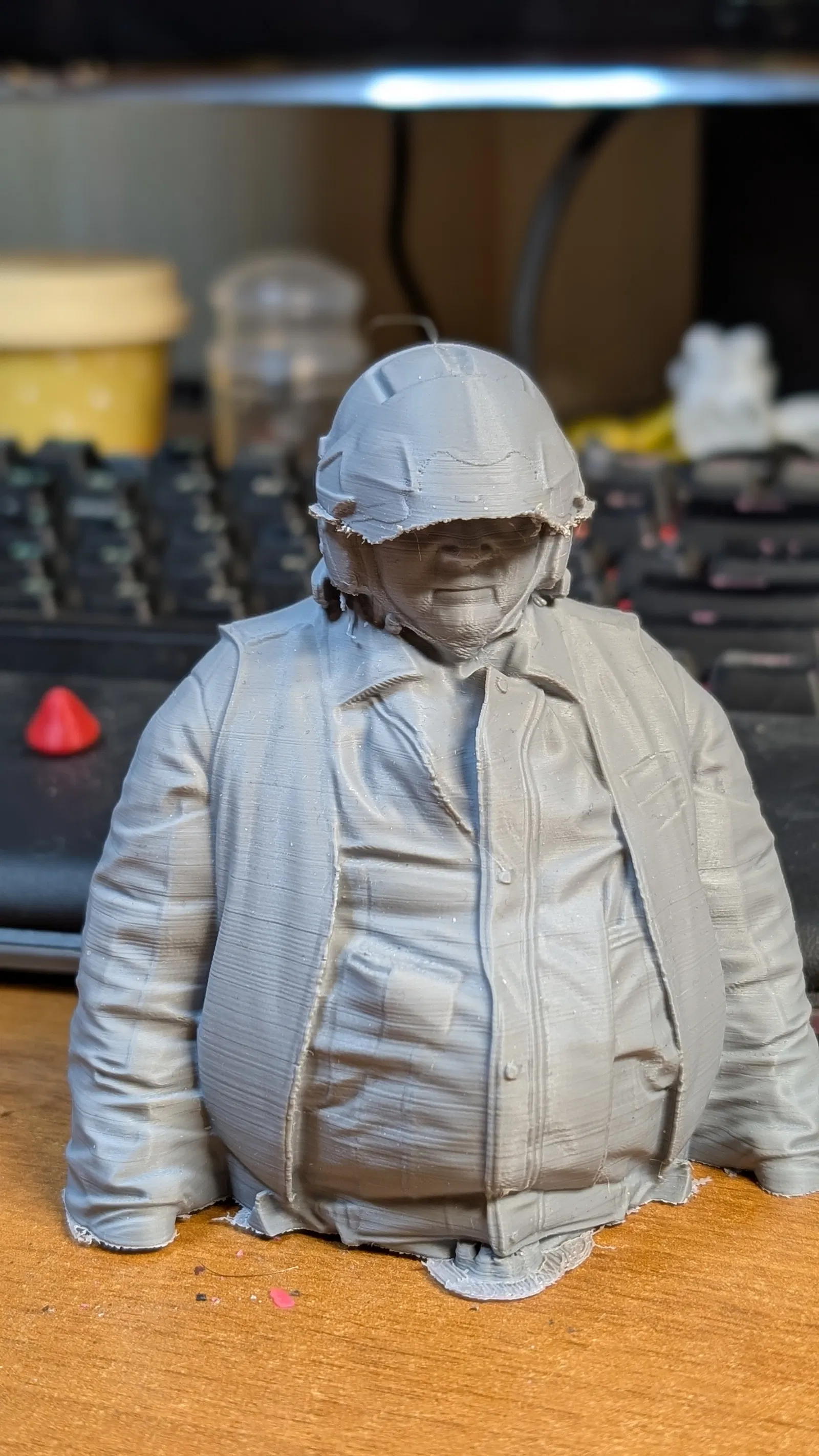 Đây là một mẫu in 3D khá thú vị để bạn thử nghiệm kỹ năng hoàn thiện sản phẩm của mình. Mặc dù hình dáng tổng thể khá tròn trịa và chắc chắn, nhưng các chi tiết trên nếp gấp áo khoác và phần mũ bảo hiểm đòi hỏi sự tỉ mỉ trong khâu thiết lập in ấn. Sản phẩm sau khi in xong có thể dùng làm quà tặng cho bạn bè, những người đam mê sưu tầm mô hình nhỏ hoặc chỉ đơn giản là vật phẩm trang trí để tạo thêm điểm nhấn cho không gian sống của bạn.