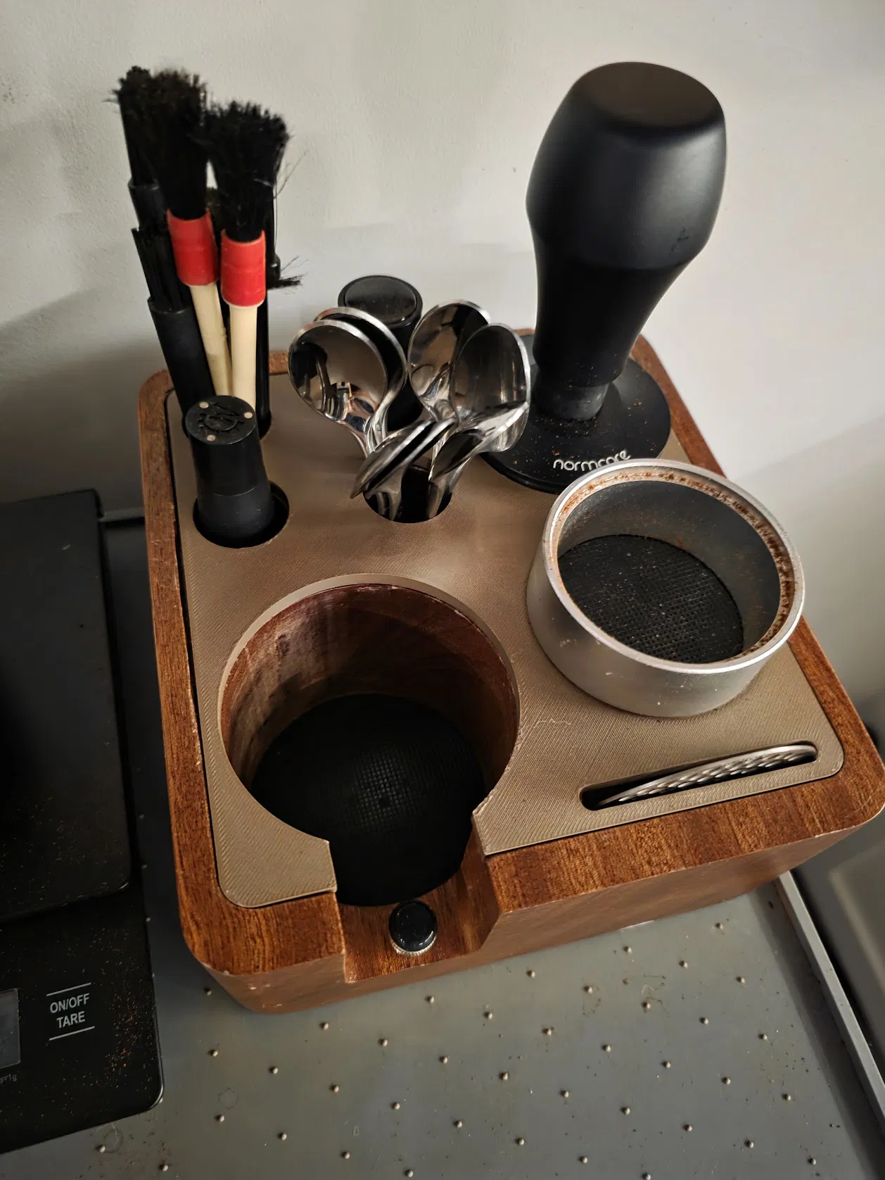 Phần này được thiết kế để thay thế miếng lót đi kèm với trạm nén cà phê (tamping station). Vì miếng lót zin trên thiết bị của mình không dùng được, nên mình đã tự thiết kế và in ra một phiên bản thay thế hiệu quả hơn.