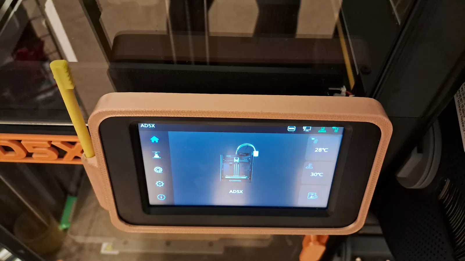 Đây là phần khung viền (bezel) trang trí cực đẹp cho máy AD5X, có tích hợp thêm giá đỡ bút stylus ở bên hông. Mình thiết kế giá đỡ nằm ở cạnh bên để anh em thao tác lấy bút thuận tiện hơn. Mình đã in thử trên máy AD5X và có sử dụng thêm hiệu ứng 'fuzzy skin' để tăng độ thẩm mỹ.
