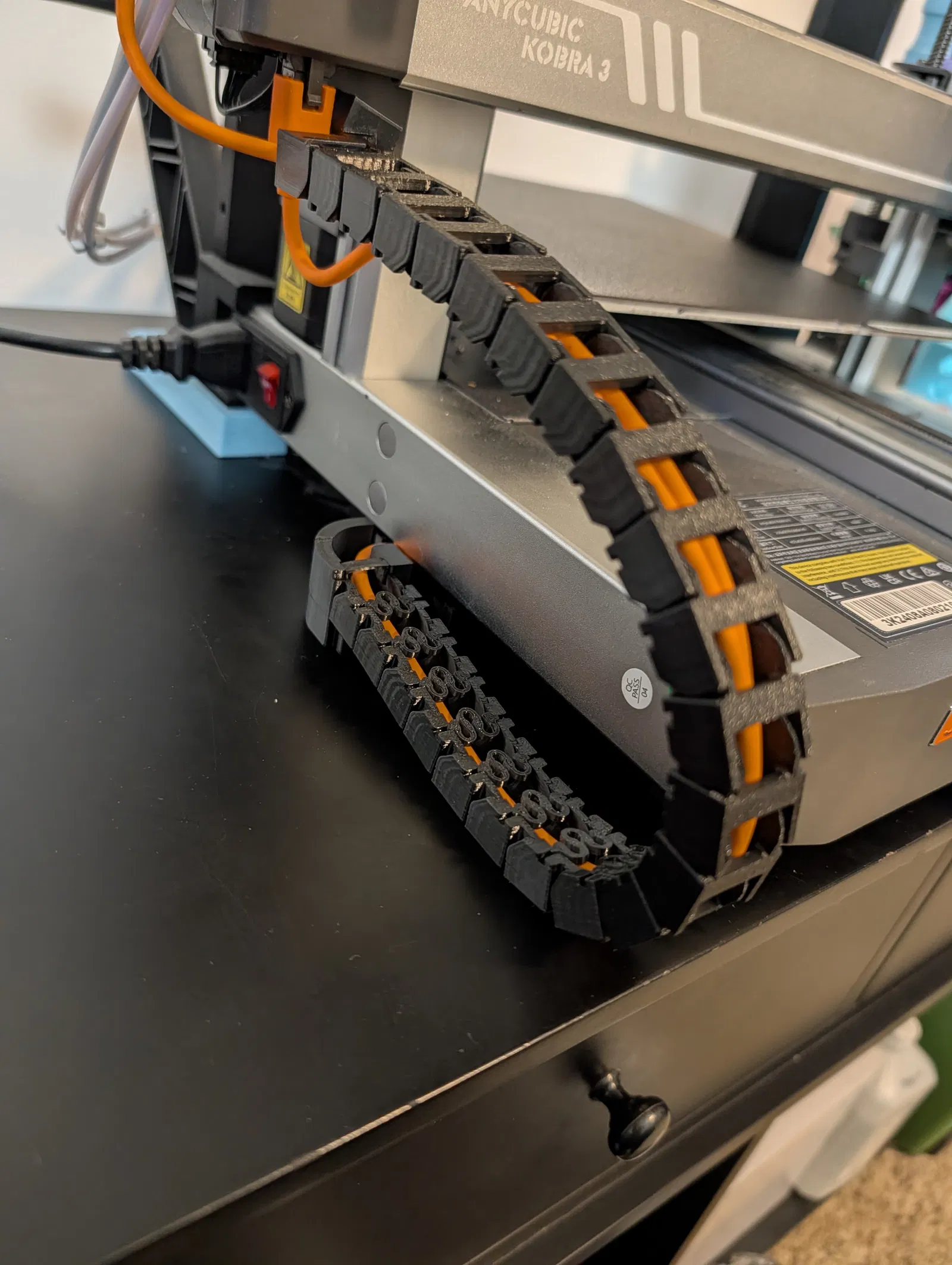 Bạn đang tìm cách quản lý dây cáp cho chiếc máy in 3D Anycubic Kobra 3 của mình? Đặc biệt là khi bạn đã lắp thêm bộ chân nâng cho máy? Mẫu giá đỡ xích dẫn cáp này chính là giải pháp mà bạn cần. Với thiết kế bổ sung phần đế nâng cao 10mm, linh kiện này giúp bù đắp khoảng cách hoàn hảo, đảm bảo xích cáp không bị căng, vướng hay va chạm khi máy đang vận hành. Đây là phụ kiện 3D hữu ích giúp bảo vệ hệ thống dây điện, tăng tính thẩm mỹ và độ bền cho máy in. Bạn nên in bằng nhựa PETG hoặc ABS để đảm bảo độ chịu lực và độ bền tốt nhất trong môi trường hoạt động thường xuyên của máy in 3D.