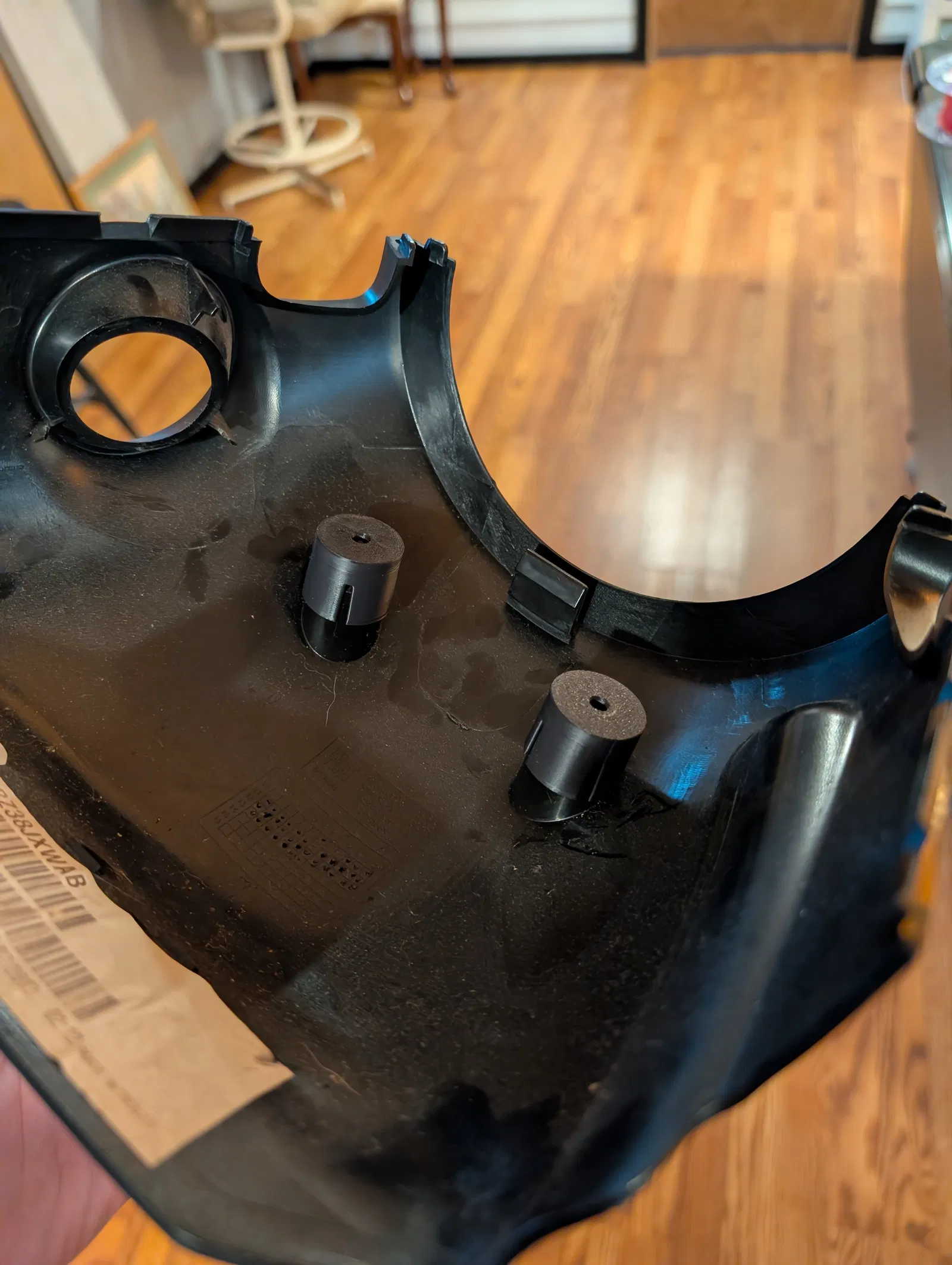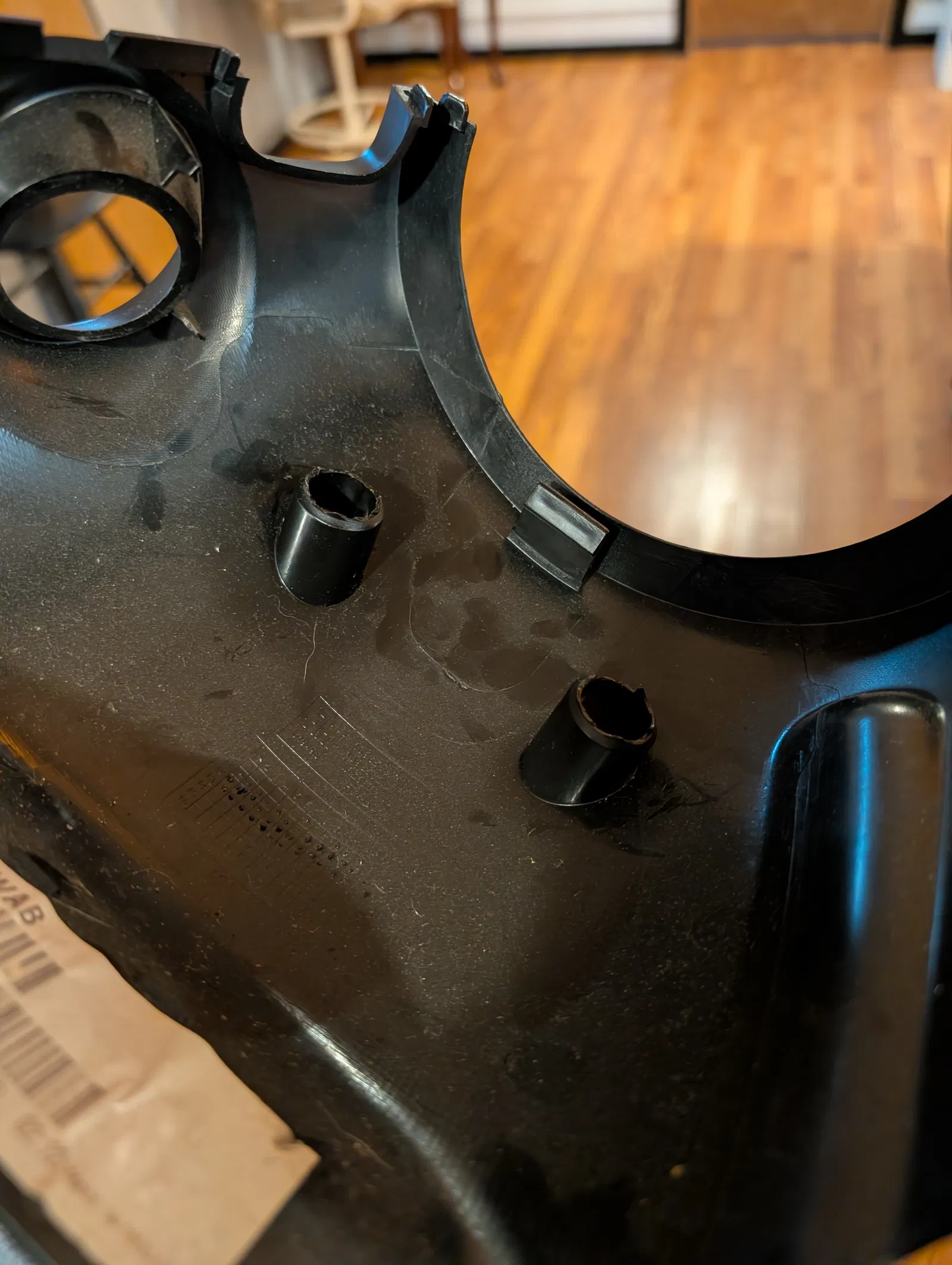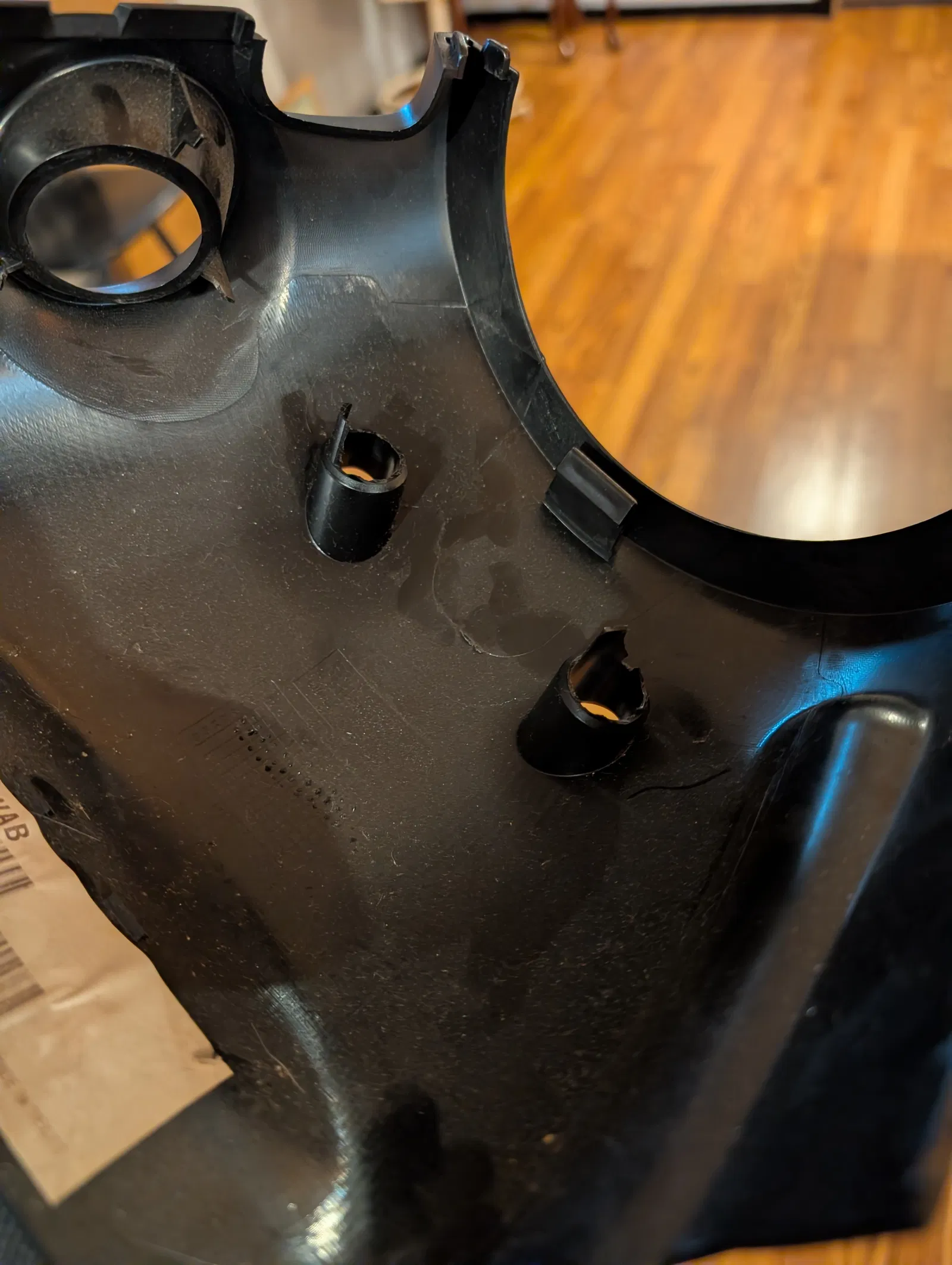 Dùng keo dán sắt dán các miếng này vào phần chân nhựa còn sót lại trên ốp cổ lái zin (OE steering column cover). Bạn nên in bằng chất liệu ABS hoặc ASA. Do ốp cổ lái theo xe được làm từ nhựa ABS-PC, nên chất liệu ABS/ASA sẽ bám dính cực kỳ tốt chỉ với keo dán sắt thông thường. Lưu ý: nếu vẫn còn các mảnh nhựa mỏng, dài dính trên phần gờ dày, bạn cứ bẻ bỏ chúng đi để lắp đặt được dễ dàng nhé.