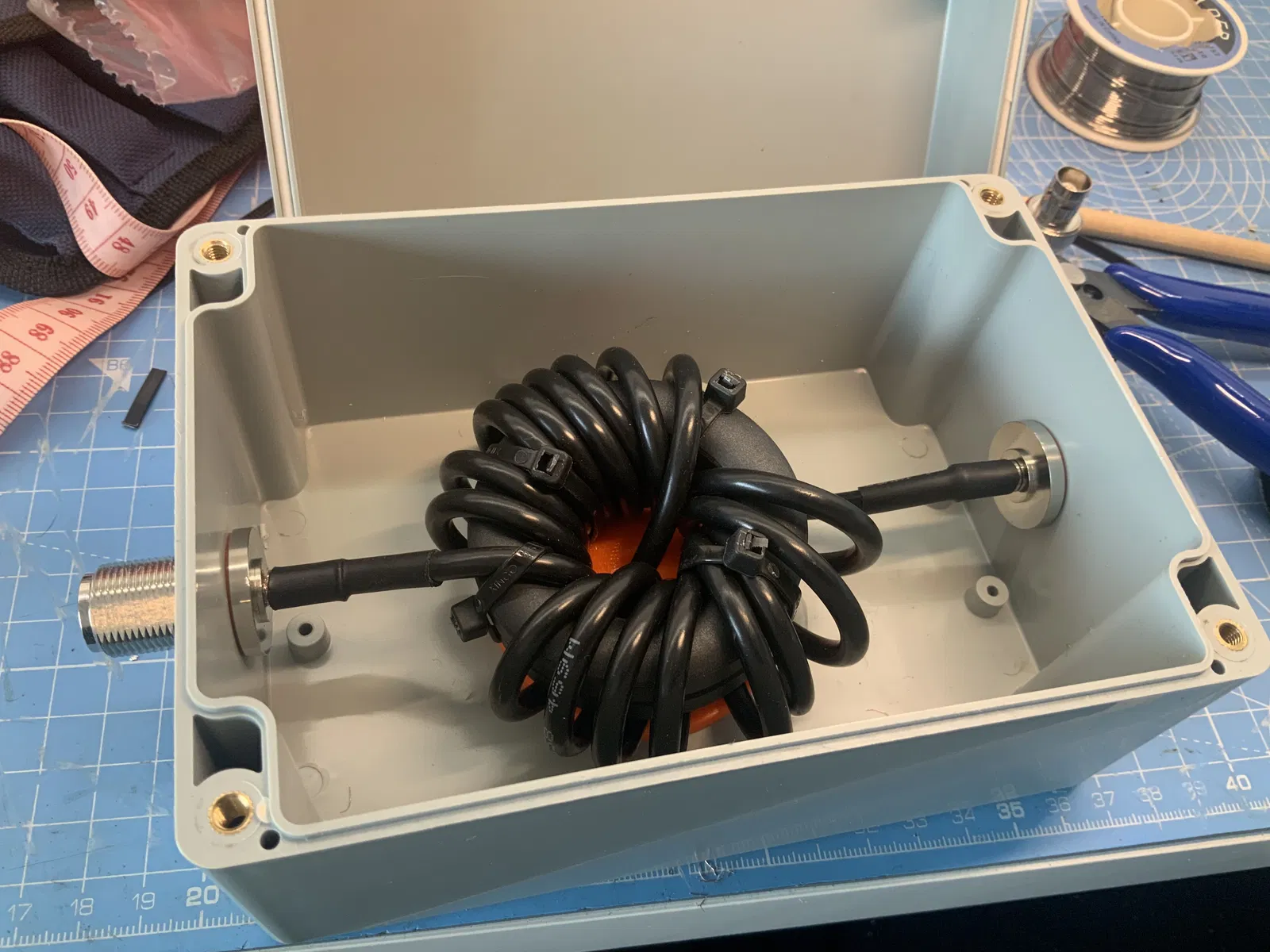 Ý tưởng của thiết kế này là dán phần đế vào bên trong vỏ hộp dùng để lắp bộ balun, sau đó sử dụng các lỗ có sẵn để cố định một hoặc nhiều lõi ferrite bằng dây rút nhựa.