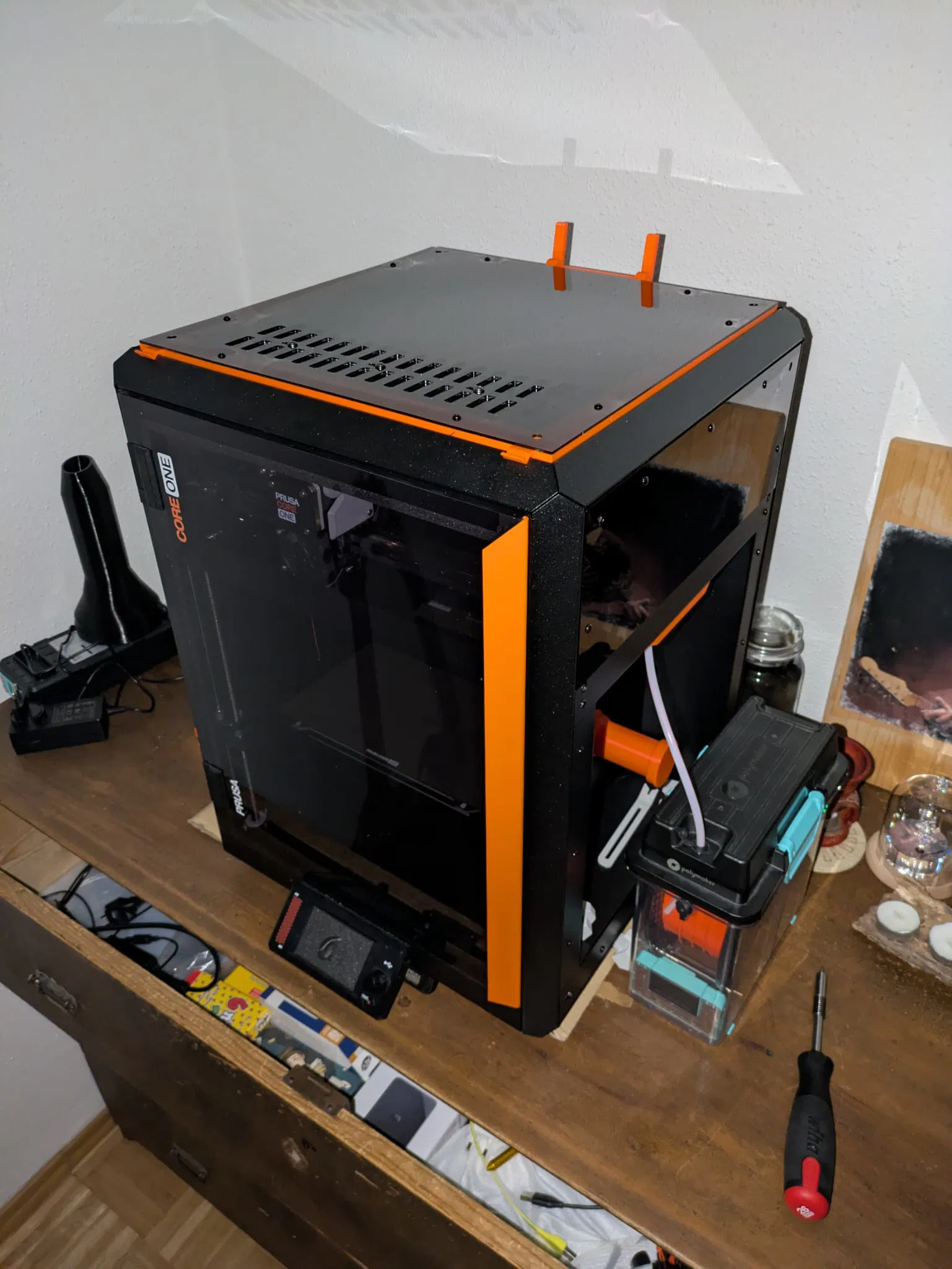 Mình đã đính kèm luôn phần điều chỉnh (+5mm) cho khối thông gió tự động của máy CoreOne+ vào đây. Mình biết là đã có vài mẫu nắp trên (top cover) cho Core One/+ rồi. Mình tự thiết kế phiên bản riêng vì muốn nó mỏng nhất có thể và lắp ráp thật dễ dàng. Mình cũng muốn khi in không cần dùng support và khi lắp không phải dùng keo. :) Cấu hình: Các linh kiện cần cho nắp có bản lề (như trong ảnh): 3x "straight_standard.stl" 1x "straight_with_hinges.stl" 3x "corner_part1.stl" 3x "corner_part2.stl" 1x "corner_part1_with_handle.stl" 1x "corner_part2_with_handle.stl" 1x "hinge_left_side.stl" (nhớ kiểm tra hướng in cho chuẩn nhé) 1x "hinge_right_side.stl" (nhớ kiểm tra hướng in cho chuẩn nhé) Nếu bạn không cần bản lề thì chỉ cần in 4 cái "straight_standard.stl" và bỏ qua các linh kiện bản lề là được. Nếu bạn thắc mắc: Các hốc trên các chi tiết thẳng được thiết kế để giúp bản in có xu hướng hơi cong xuống sau khi hoàn thành. Như vậy, bạn sẽ có độ khít cao giữa chi tiết nhựa và nắp mica (plexiglas). Bạn cũng có thể tùy chọn số lượng góc có tay cầm tùy theo nhu cầu sử dụng. Vật liệu bổ sung cần thiết: 8x ốc vít M3x5 kèm 8x đai ốc M3 tiêu chuẩn 4x nam châm 10x5x2 mm (tùy vào độ hút của nam châm mà bạn có thể bớt ra nếu muốn) 8x nam châm 20x10x2 mm (tùy vào độ hút của nam châm mà bạn có thể bớt ra nếu muốn) Tổng quan: Mình thiết kế hai hốc trong mỗi góc. Một hốc chứa được một nam châm 10x5x2mm, hốc còn lại chứa được hai nam châm 20x10x2mm. Sau khi lắp xong thì các hốc này đều được đóng kín, nên bạn dùng nam châm nhỏ hơn hoặc bớt bớt đi cũng không sao. Không cần dùng keo nhé. Vật liệu và thiết lập in: Máy in: Core One Nhựa PETG (mình dùng màu cam Prusament cho hợp tông) Profile tiêu chuẩn Prusament PETG trên PrusaSlicer 2.9.4 Đầu phun 0.4mm HF Copper * Layer 0.2mm STRUCTURAL (mình thử cả chế độ BALANCED và in vẫn ngon lành) Đừng ngại hỏi nếu bạn cần thay đổi thiết kế hoặc điều chỉnh kích thước hốc nam châm nhé. Bạn cũng có thể tự chỉnh sửa các chi tiết theo ý mình vì mình đã đính kèm file .step của toàn bộ phần khung rồi. Hy vọng bạn sẽ thích nó.