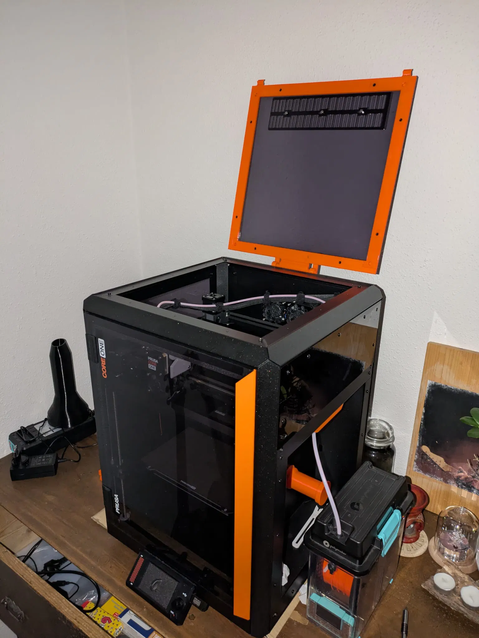 Thiết kế nắp trên cho Prusa CoreOne/+ với độ dày 5mm, tích hợp nam châm và tùy chọn bản lề. Sản phẩm được tối ưu để in không cần support và lắp ráp không cần keo, đảm bảo độ khít hoàn hảo với nắp mica. Bao gồm cả tùy chọn cho CoreOne+.
