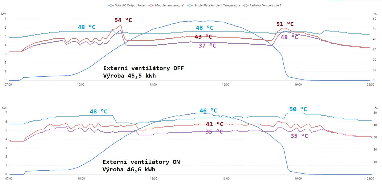 Bạn có thể thấy nhiệt độ của bộ điều khiển mà không/có làm mát bên ngoài. Nhiệt độ bên ngoài khoảng 28 °C.