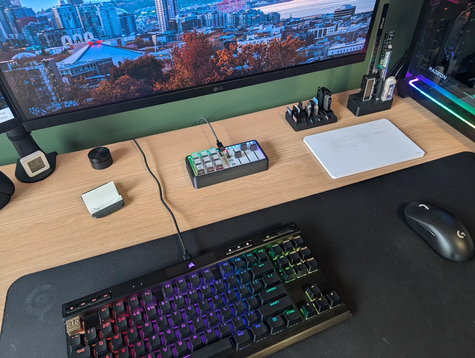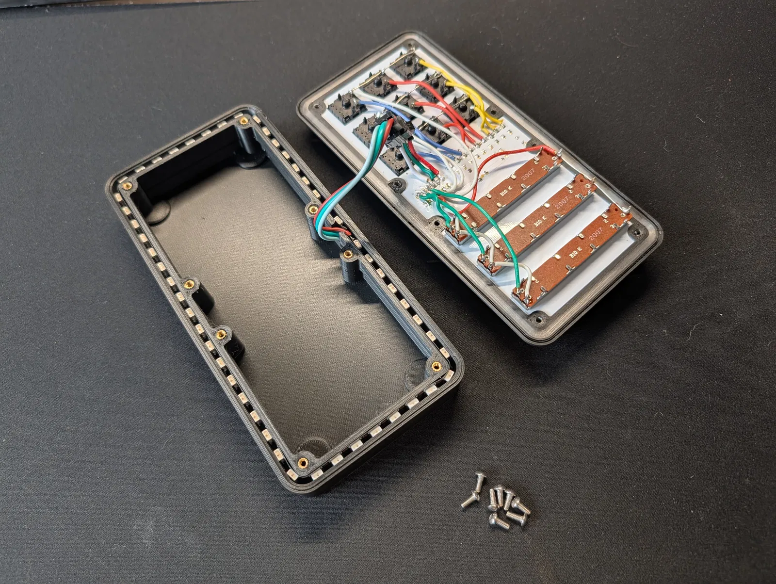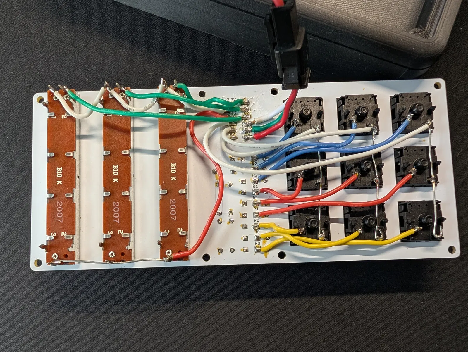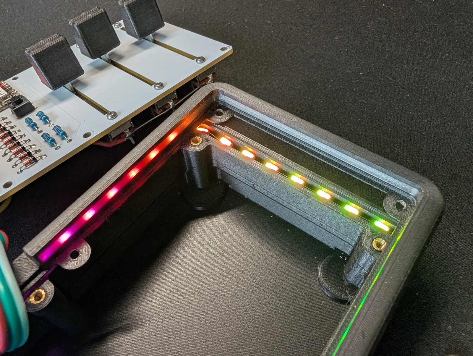 Sau khi rất thích bộ macro keypad DIY đầu tiên của mình, mình quyết định tạo ra phiên bản thứ hai với thiết kế độc đáo và nhiều tính năng hơn. Mình muốn kết hợp khả năng tùy chỉnh macro với các cần gạt trượt (potentiometer) để điều chỉnh âm lượng riêng biệt cho từng ứng dụng bằng Deej. Macro pad này chú trọng vào thẩm mỹ hơn là chi phí thấp hay lắp ráp dễ dàng. Các phím switch được gắn trực tiếp xuyên qua PCB nên cần phải đi dây thủ công ở mặt sau, và dải đèn LED hắt sáng bên hông cho RGB cũng hơi đắt tiền một chút. Nhưng mình cực kỳ ưng ý với thành quả cuối cùng, trông nó đặt trên bàn làm việc rất xịn.