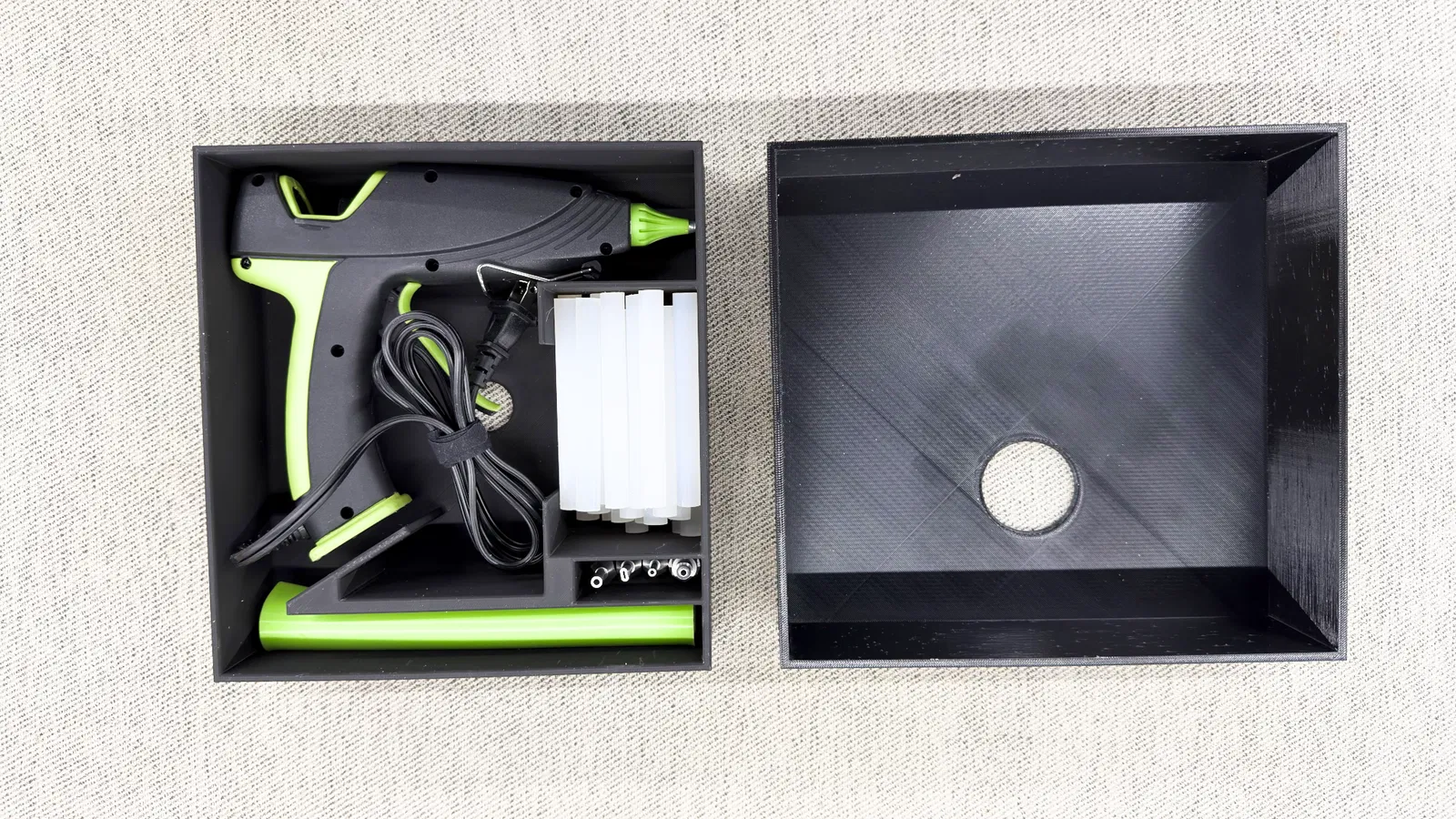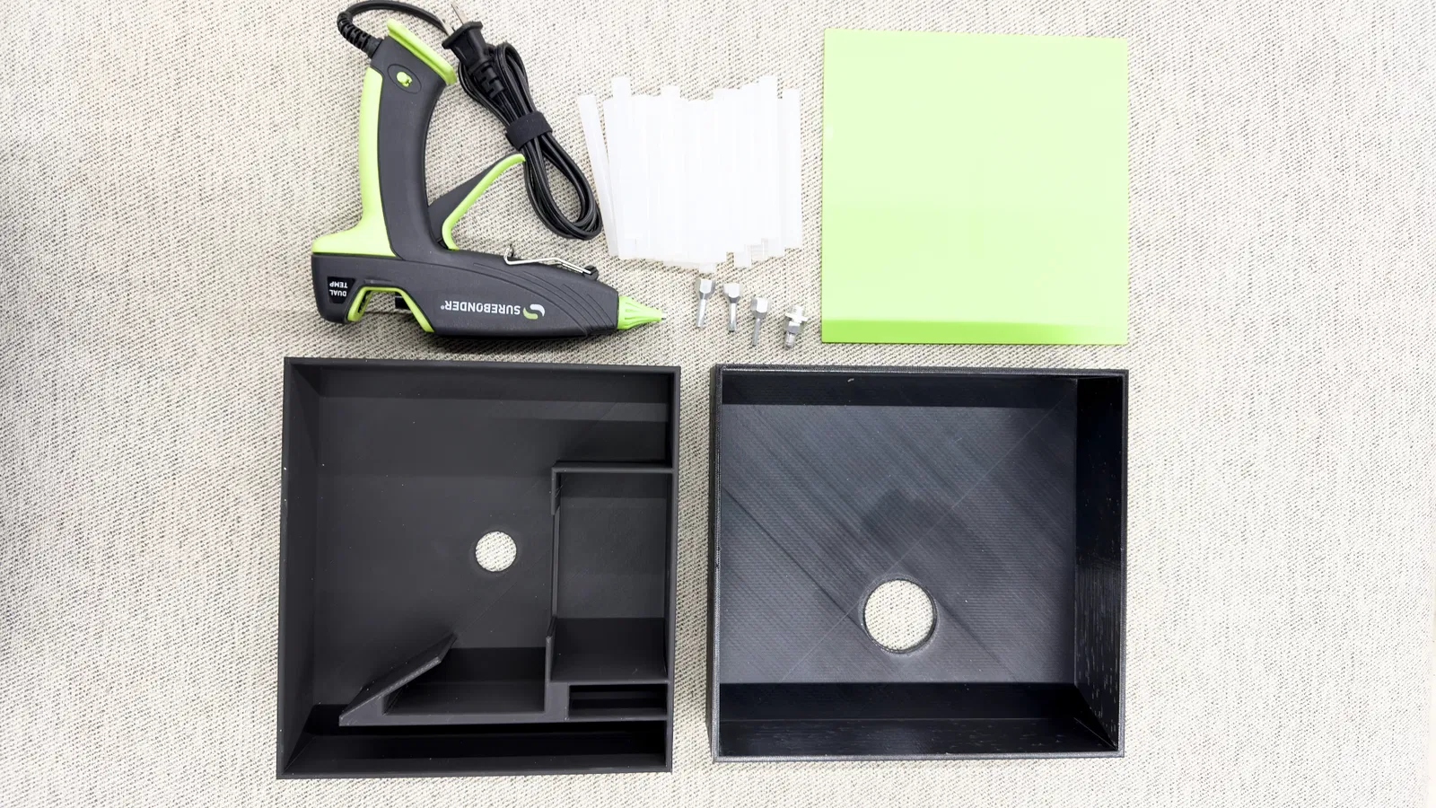 Hộp đựng chuyên dụng cho súng bắn keo Surebonder Ultra Series 100W và phụ kiện. Thiết kế vừa khít, có ngăn chứa đầu vòi, keo nến và miếng lót silicon. Phù hợp in trên khổ máy Bambu Lab X1 Carbon.