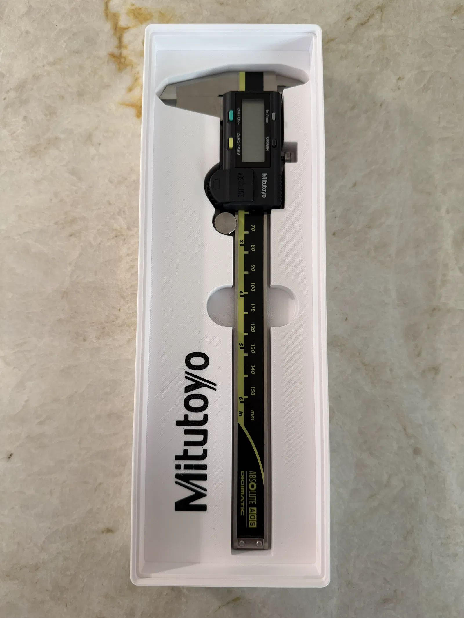 Khay Gridfinity kích thước 6x2x4 được thiết kế hai màu dành cho thước kẹp kỹ thuật số Mitutoyo 500-196-32. Mình đã bố trí chỗ để kẹp nắp pin kim loại ngay phía dưới tay cầm.