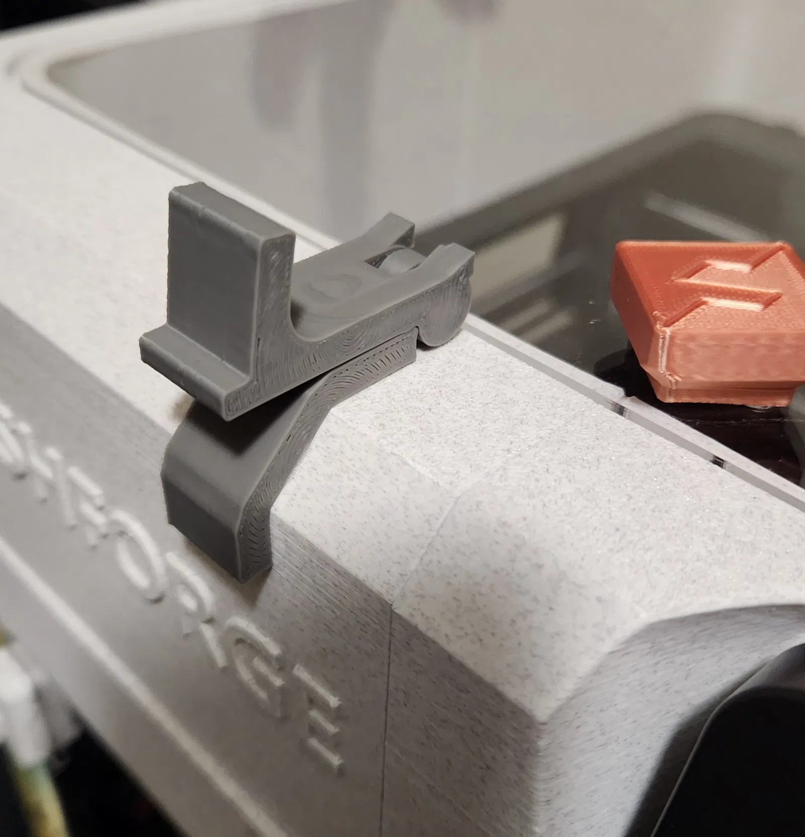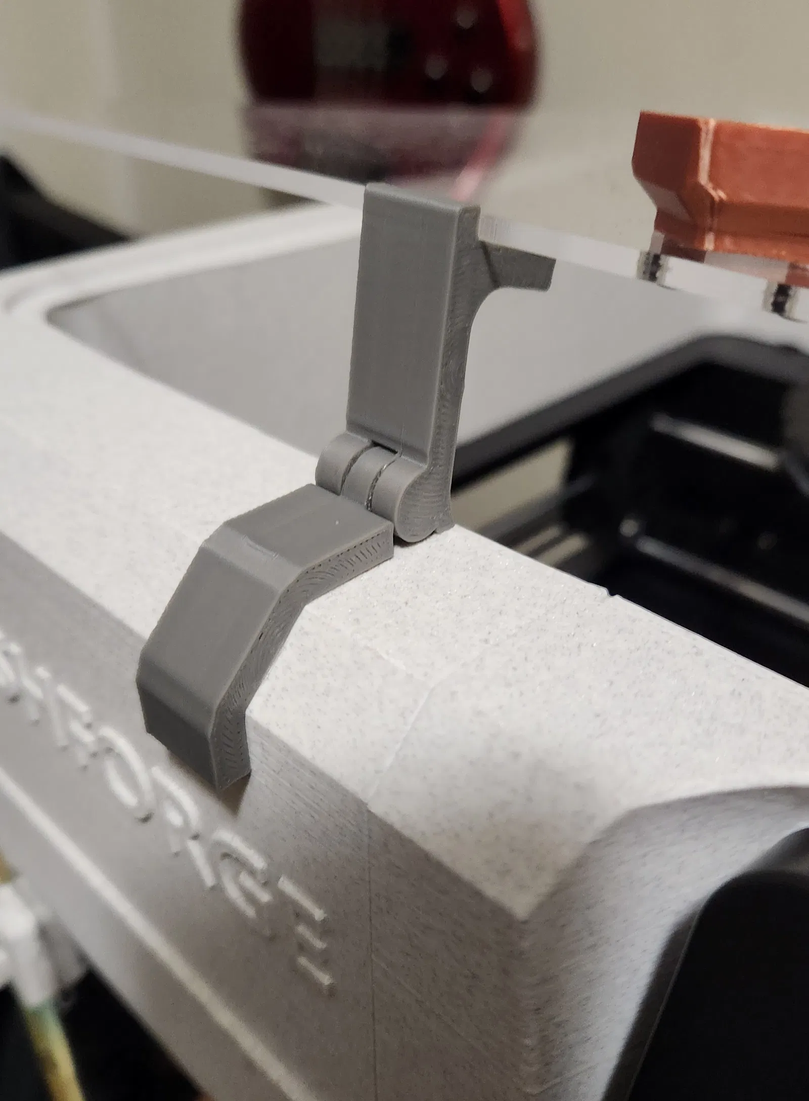 Mình muốn làm một cái giá đỡ mà không sợ bị thất lạc, nên đã chỉnh sửa thêm phần bản lề và chốt chặn để nắp không bị gập quá đà về phía trước. Mình in bằng thiết lập tiêu chuẩn của Orca-Flashforge với nhựa PLA. Sau đó, chỉ cần dán cố định vào vỏ máy Flashforge bằng keo 502 là xong.