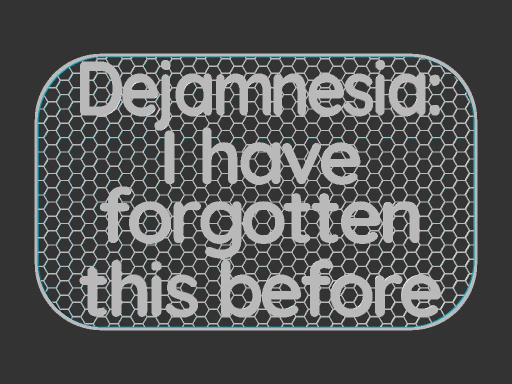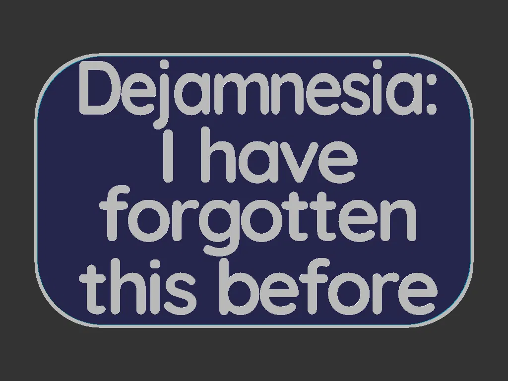 Bảng hiệu kích thước 100x160mm, với dòng chữ "Dejamnesia: I have forgotten this before" (tạm dịch: Dejamnesia: Tôi đã từng quên điều này trước đây).