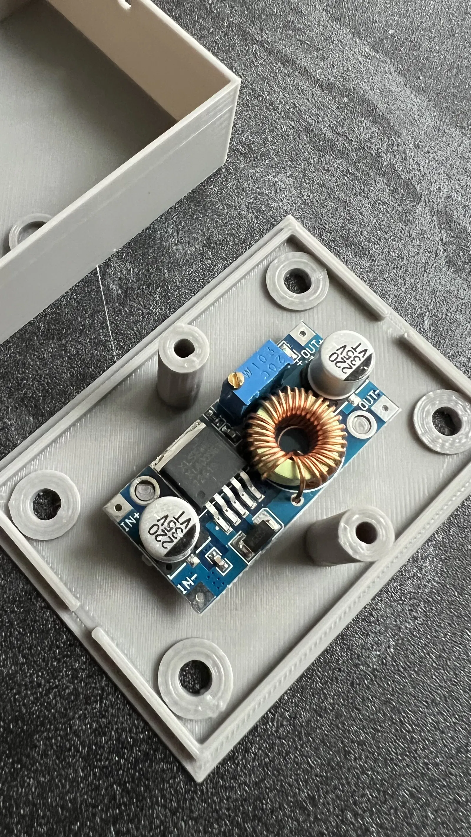 Đây là hộp bảo vệ cho module hạ áp DC-DC XL4005. Mình thiết kế nó khá rộng rãi để các bạn dễ dàng đi dây và giúp module tản nhiệt tốt hơn. Hộp có sẵn các lỗ để bắt vít lên nhiều bề mặt khác nhau, phần nắp phía trên được cố định bằng hai con ốc. Mình đã in thử bằng nhựa PLA và khá ưng ý với thành phẩm này.