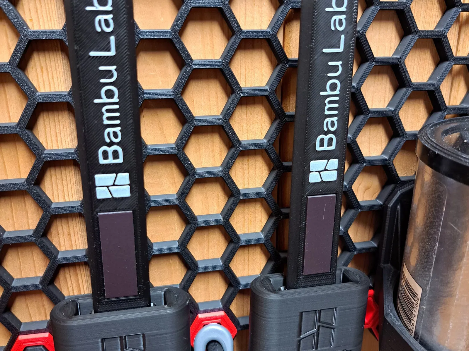 Người giữ máy cạo phòng thí nghiệm Bambu dành cho hệ thống lưu trữ tường tổ ong. Logo BL và văn bản được thêm ở mặt trước.