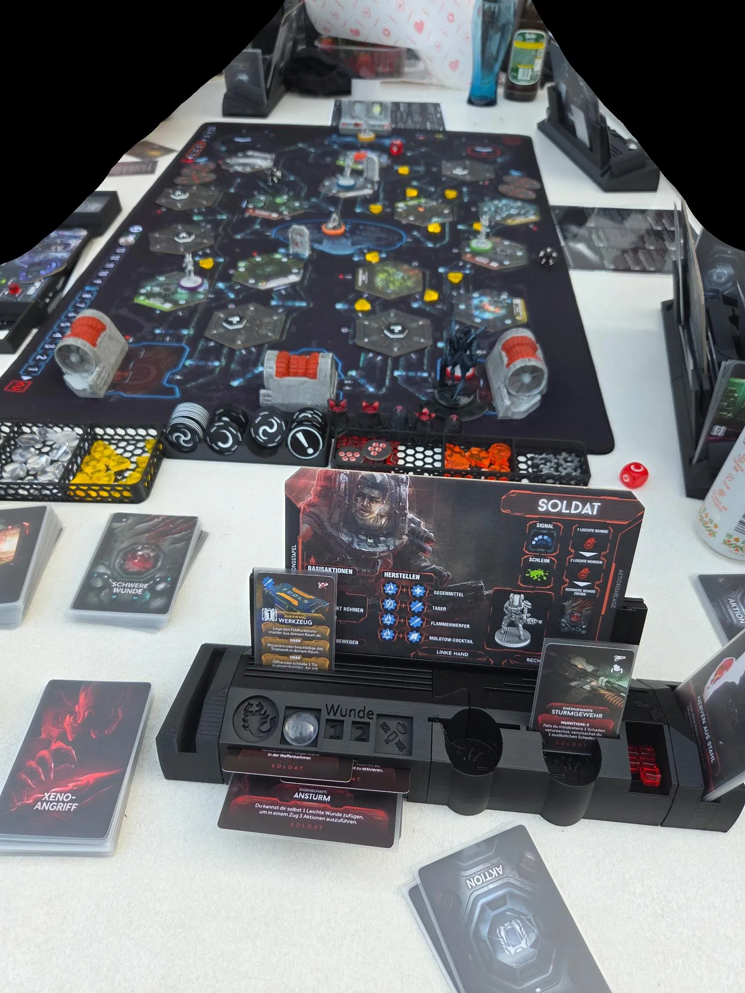 Vì bàn chơi game của mình hơi nhỏ không đủ chỗ để bày hết các thành phần của trò Nemesis, nên mình đã quyết định thiết kế ra cái bảng điều khiển dạng đứng này. Mình làm theo kiểu module để anh em dễ in ấn hơn, đồng thời cũng tiện sửa chữa hoặc in lại phần nào đó nếu sau này có phiên bản mới.
