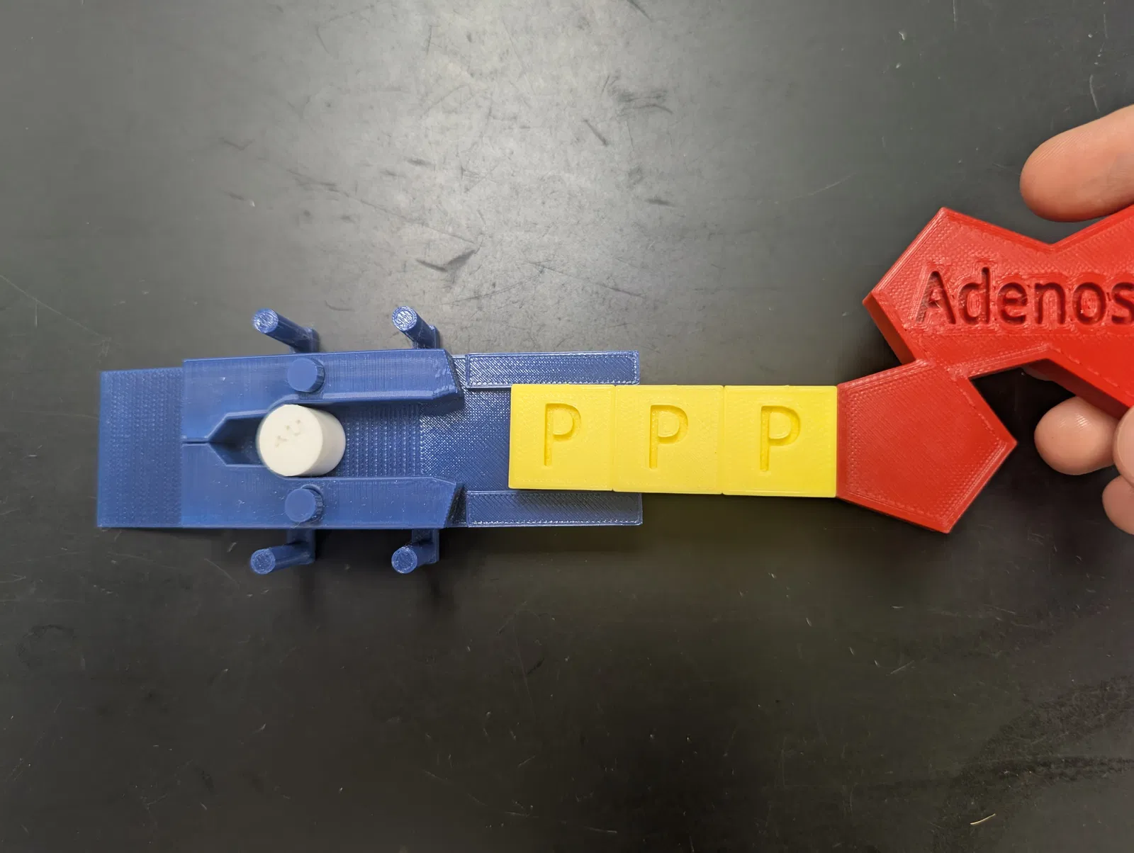 Các cánh tay nên được in theo hướng thẳng đứng để giảm thiểu tối đa support. Bạn có thể cần làm sạch phần lỗ ở giữa mỗi cánh tay để đảm bảo nó có thể xoay linh hoạt trên các trục trung tâm của đế protein. Mỗi cánh tay cần được gắn một viên nam châm đĩa 4x2mm vào phần đầu lớn, và hãy chú ý hướng cực từ của hai cánh tay ngược nhau. Việc này tạo ra đủ lực hút để hai đầu cánh tay dính vào nhau khi ở trạng thái nghỉ trên đế protein. Phần đầu hẹp của mỗi cánh tay nên được gắn một viên nam châm đĩa 7x3mm, với cực từ ngược lại so với phía bên trái của các nhóm phosphate được tạo ra từ Mô hình ATP từ tính.