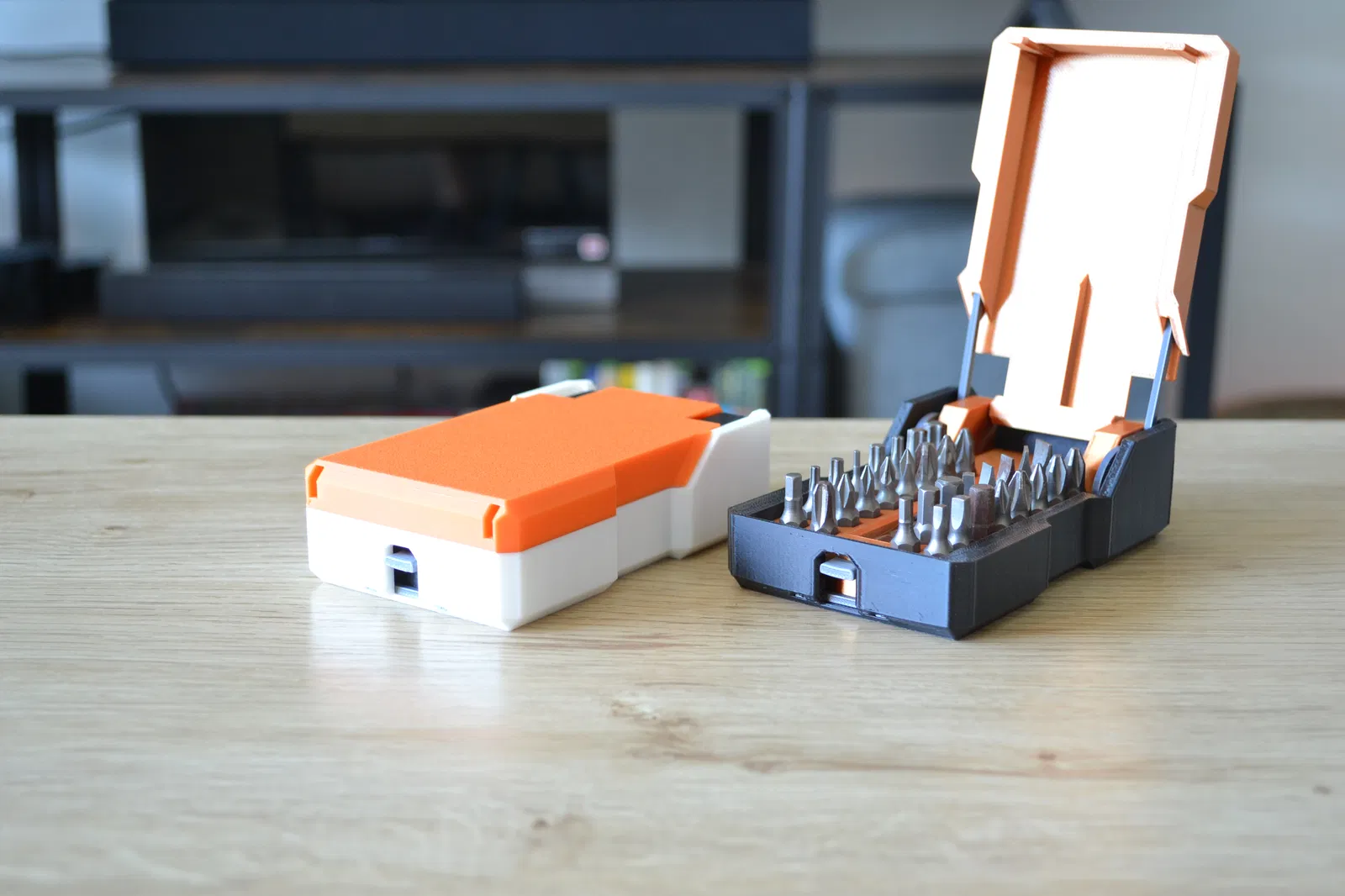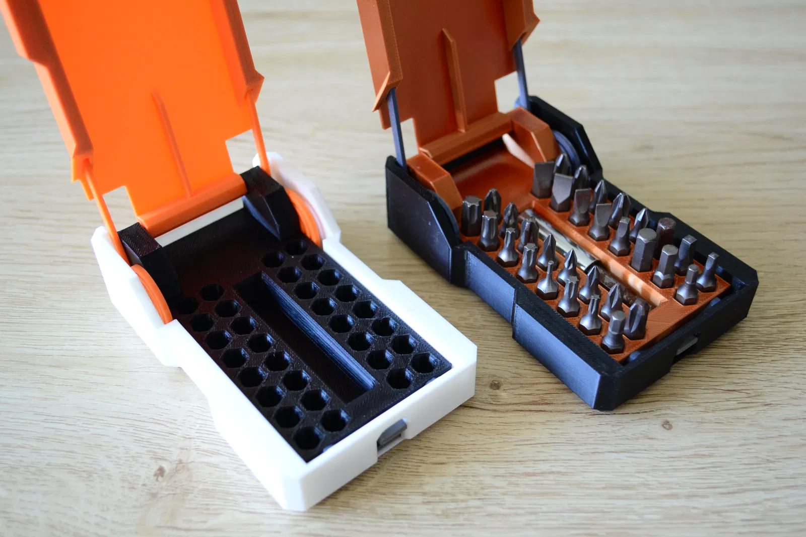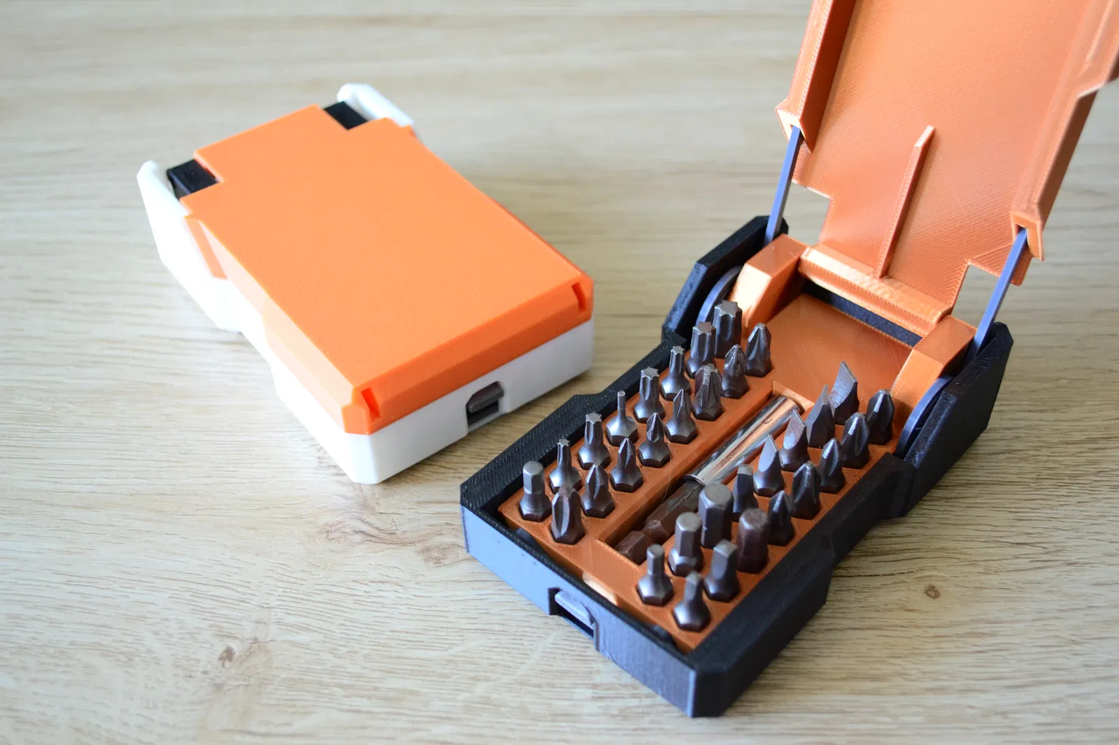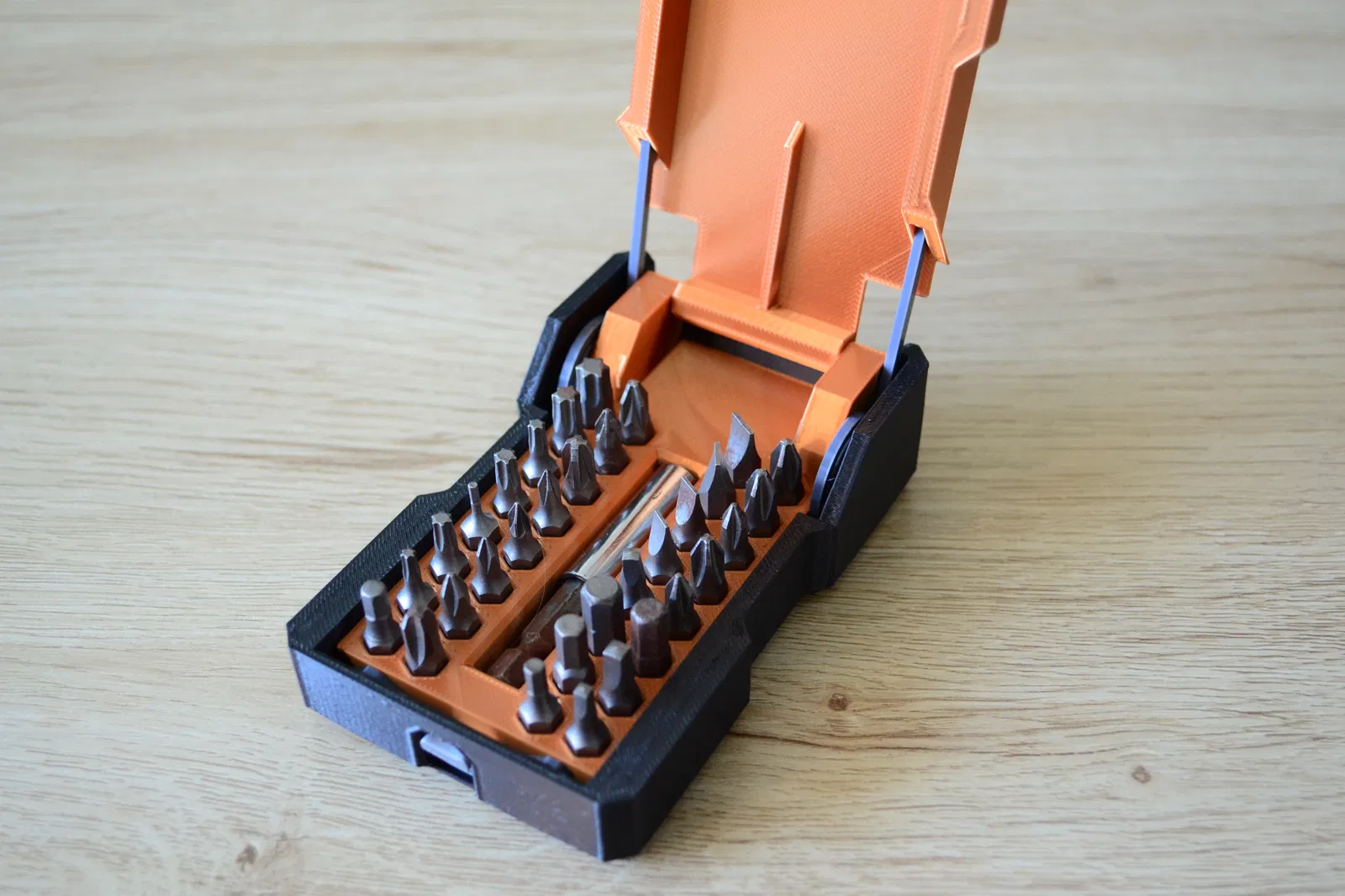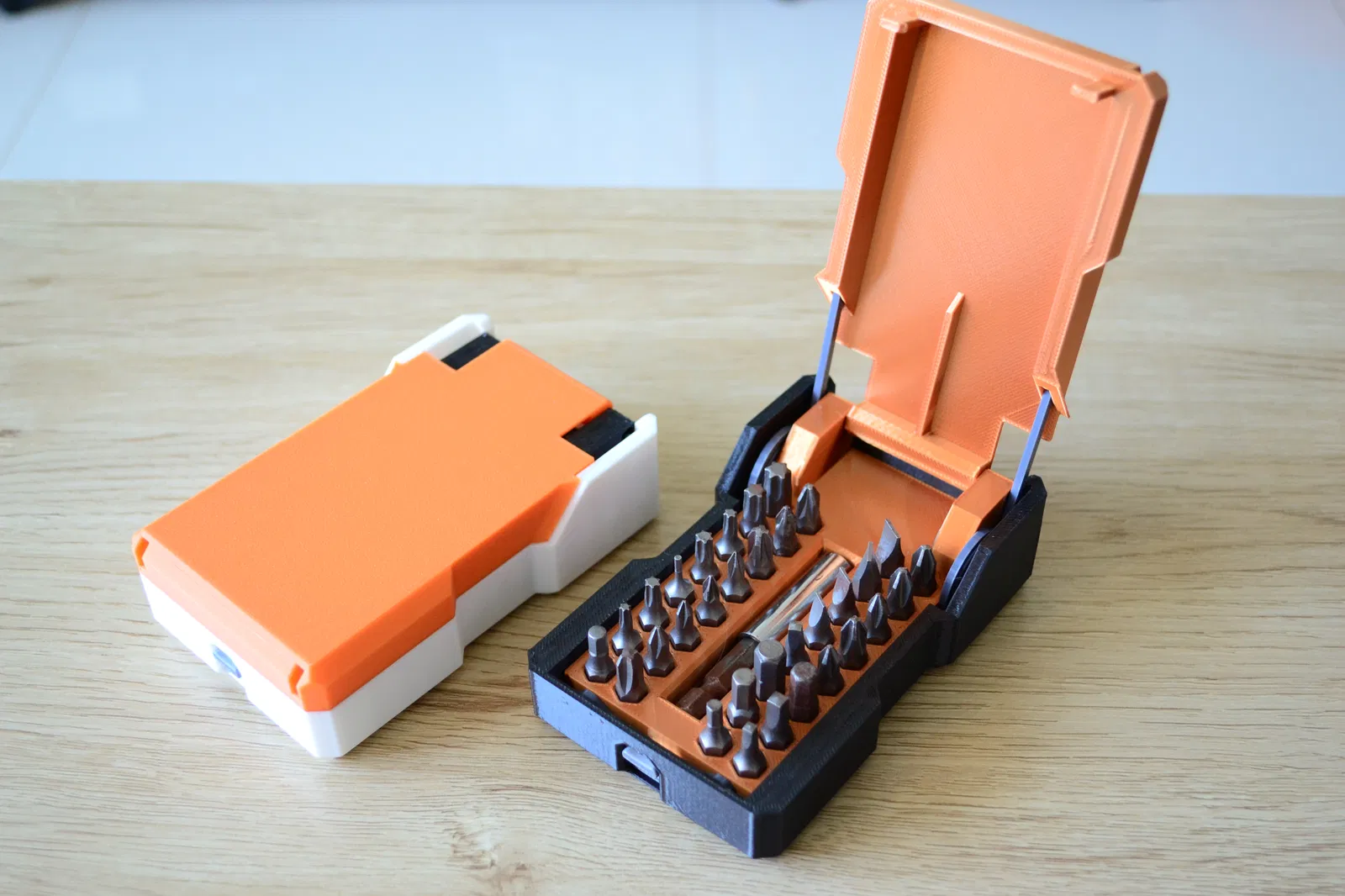 Không cần thêm phụ kiện ngoài! À, có thể cần một chút keo dán xD Các lò xo cũng được in 3D luôn. Chỉ cần nhấn nút là nắp sẽ tự động bật mở. Đây là một cơ chế nhỏ rất đã tay, giúp việc sắp xếp dụng cụ trở nên thú vị hơn nhiều. Hộp này chứa được tới 32 mũi vít lục giác và còn có chỗ riêng cho đầu nối dài nữa.