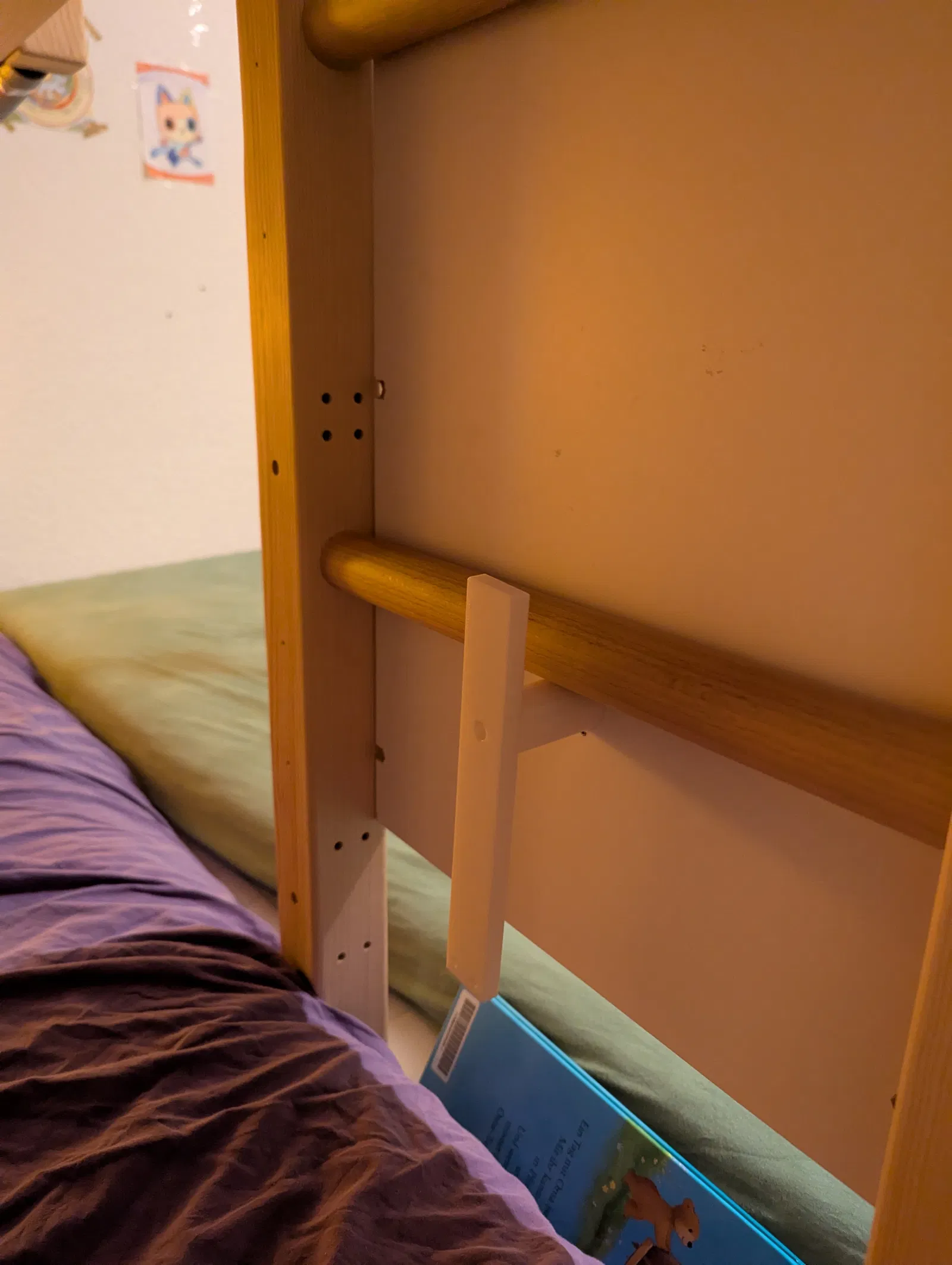Để ngăn mấy đứa nhỏ tháo tấm chắn cầu thang giường tầng ra, mình đã thiết kế một cái chốt khóa đơn giản. Cái này được bắt vít vào mặt sau của tấm chắn ngay dưới một bậc thang. Nhờ trọng lực, nó sẽ tự động khóa lại. Khi cần tháo tấm chắn, bạn chỉ cần thò tay ra sau để xoay chốt là được. Hai đứa nhỏ nhà mình (1.5 tuổi và 4 tuổi) vẫn chưa tự tìm cách tháo ra được.