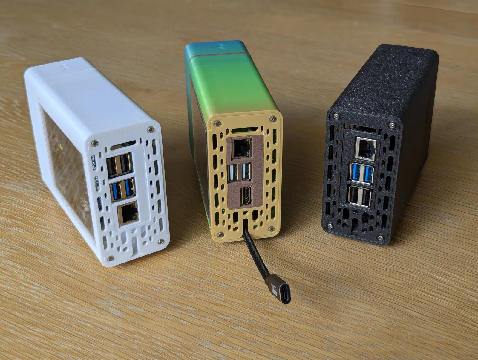 Mình cũng có làm sẵn khe cắm cho các thiết bị dùng nguồn USB (như bản in màu cầu vồng), cho phép luồn cáp nối dài USB (kết nối với bo mạch bằng đầu cắm góc 90 độ) ra phía sau case. Những loại cáp nối dài này bạn có thể tìm mua dễ dàng trên AliExpress hoặc các trang tương tự.