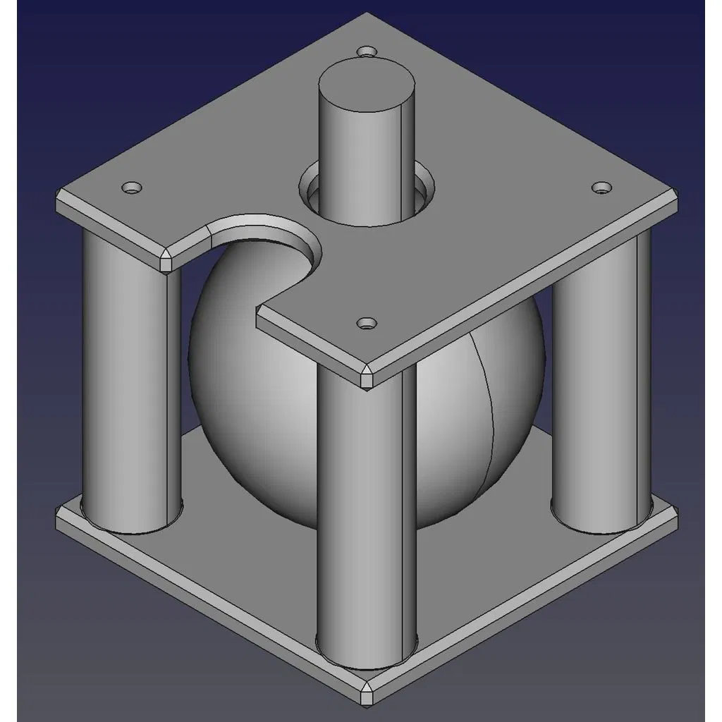 *Phần trên (x1):* Có lỗ thẳng đứng cho cổng hút và một phần cắt tròn để khớp với ống xả nghiêng. Phần đáy (x1):** Có thiết kế lõm chính xác để ôm trọn phần đế của bình đáy tròn. *Chân (x4): Nối phần trên và phần đáy, đảm bảo độ vững chãi. Các phần này được cố định bằng ốc M3 12mm và ren đồng M3.