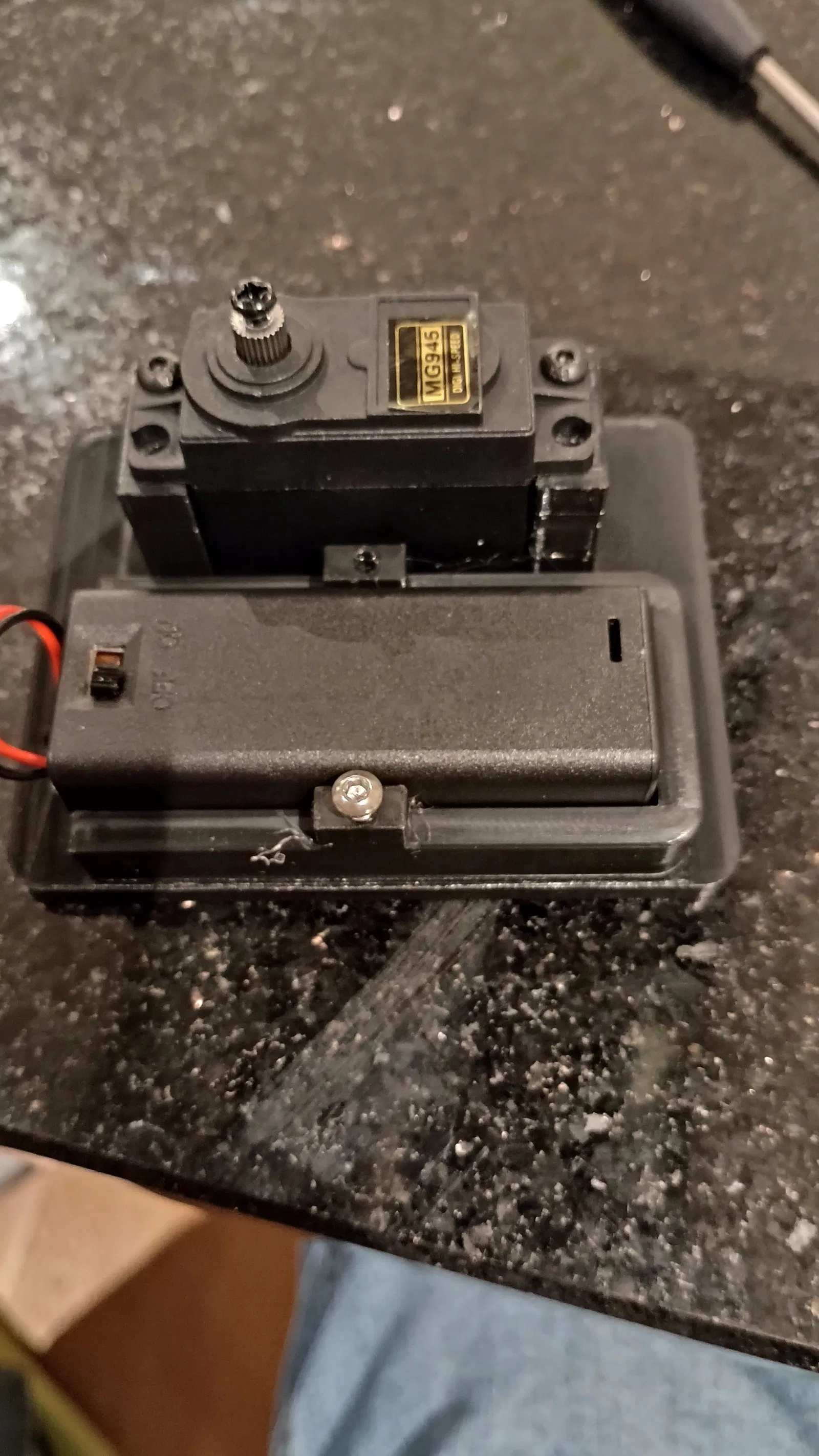 Với sự cho phép từ RCXplode. Mình đã xem video Youtube tuyệt vời của RCxplode về cách làm một chiếc giá dán lốp RC giá rẻ và mình muốn tạo ra một phiên bản tương tự nhưng có thêm công tắc. Mình quyết định tự thiết kế từ đầu dựa trên cảm hứng từ video đó. Bố cục cơ bản vẫn giống như bạn thấy trong video, nhưng mình đã sử dụng các mấu gắn servo để cố định servo thay vì dùng keo epoxy và mình cũng dùng hộp pin AA có sẵn công tắc cùng nhiều chi tiết khác. Các linh kiện cần chuẩn bị: 1x ốc M3 8mm (cho kẹp pin) 2x ốc M3 6mm (cho servo) 1x hộp pin AA có công tắc (mua trên eBay) 1x servo MG945 giá rẻ (mua trên eBay) * 2x ốc cấy nhiệt M3 (dùng để gắn servo, bạn có thể dùng 4 cái nhưng thực ra không cần thiết) Bạn hãy tháo rời và đấu dây từ hộp pin vào servo như hướng dẫn trong video của RCXplode, sau đó gắn servo và hộp pin vào phần đế đã in. Cố định pin bằng kẹp pin. Dùng ốc đi kèm với servo để gắn một trong các đầu servo (servo horn) vào bộ chuyển đổi bánh xe đã in, rồi lắp đầu servo đó vào servo. Giờ thì chọn bánh xe bạn muốn và bắt đầu dán thôi! Một lần nữa xin gửi lời cảm ơn chân thành đến RCXplode! Mình in bằng nhựa PLA 1.75mm.