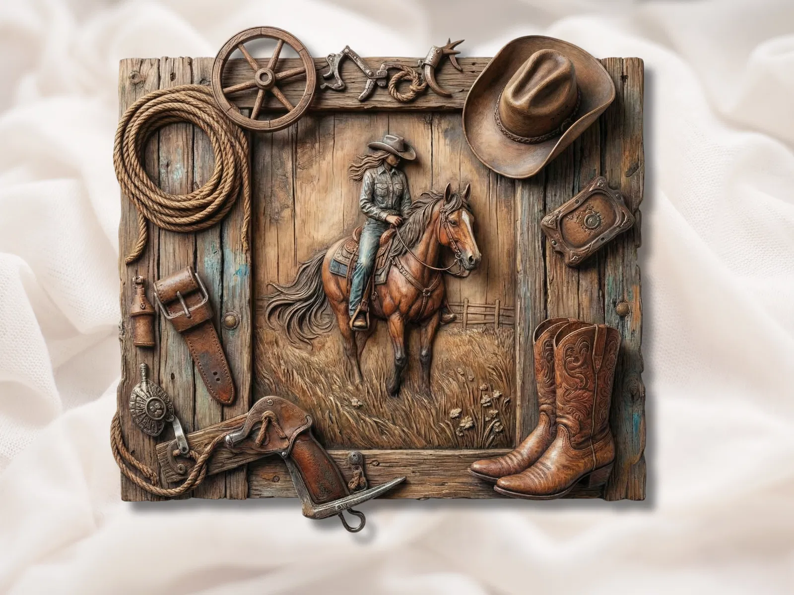 Nếu bạn là một người đam mê văn hóa miền Tây nước Mỹ, chắc chắn bạn sẽ không thể bỏ qua mẫu mô hình phù điêu cực kỳ độc đáo này. Tác phẩm này tái hiện lại khung cảnh đậm chất cao bồi với những chi tiết được thiết kế tỉ mỉ, từ hình ảnh người cưỡi ngựa đầy dũng mãnh cho đến các phụ kiện đặc trưng như dây thừng, mũ cao bồi, ủng da và bàn đạp ngựa. Đây không chỉ là một món đồ trang trí đơn thuần, mà nó còn là tâm huyết của người làm ra nó, mang đến hơi thở bụi bặm, tự do của vùng viễn Tây vào chính không gian sống của bạn.