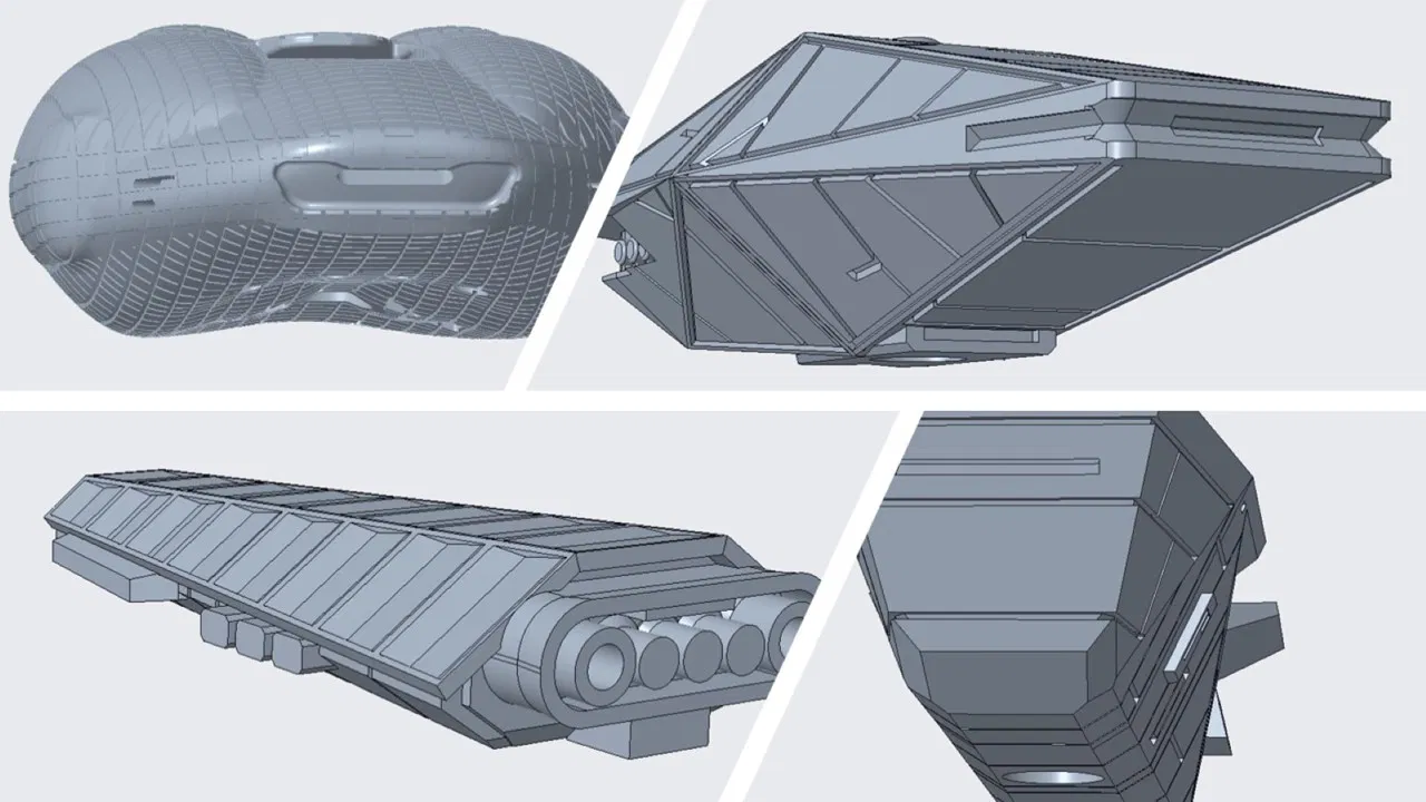 Vì thế, mình đã tạo ra bốn mẫu tàu vũ trụ phù hợp với phong cách nghệ thuật và chủ đề của cả hai phần phim Dune của Villeneuve cũng như phong cách đồ họa trong chính board game. Tất cả các mẫu tàu không phải là bản sao y hệt trong phim, mà là cách mình tái hiện lại hình ảnh phi thuyền trong vũ trụ Dune. Bao gồm: tàu của nhà Atreides (màu xanh lá) đầy thanh thoát, tàu của nhà Harkonnen (màu đỏ) giống hình dáng côn trùng, phi thuyền của quân đoàn Sardaukar của Hoàng đế (màu vàng), cùng một mẫu chiến hạm không gian chung cho phe màu xanh dương.