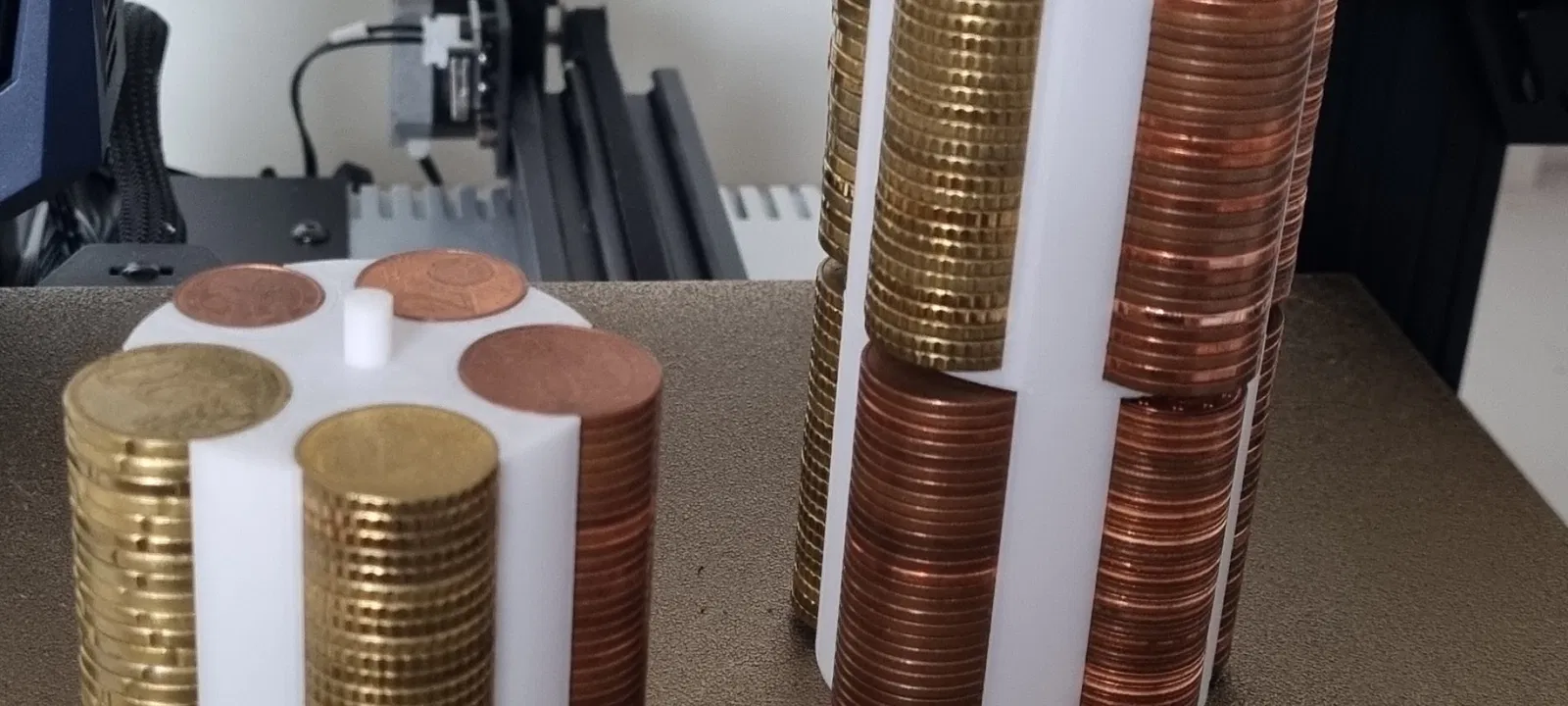tất cả được khoan một lỗ ở dưới và một cái bút ở trên. vì vậy bạn có thể xếp chồng các phần lại với nhau. mỗi chồng mười euro. Đáy của mỗi ngăn xu đã được điều chỉnh theo chiều cao.