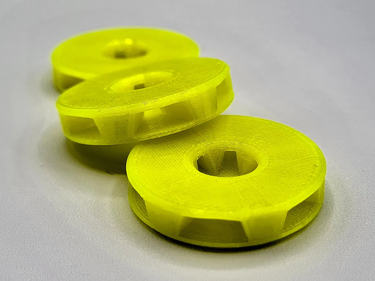 Túi hút chân không có van là giải pháp cực kỳ hữu ích để bảo quản sợi nhựa (filament) trong môi trường khô ráo. Tuy nhiên, việc ấn đầu bơm vào van trong quá trình hút thường vô tình làm tắc nghẽn đường dẫn khí. Để giúp công việc này dễ dàng hơn, mình đã thiết kế miếng đệm hỗ trợ này. Đĩa đệm giúp giữ cho luồng khí luôn thông thoáng để bạn hút hết không khí trong túi ra. Bạn có thể dùng thêm băng dính hai mặt để cố định vị trí miếng đệm chắc chắn hơn.