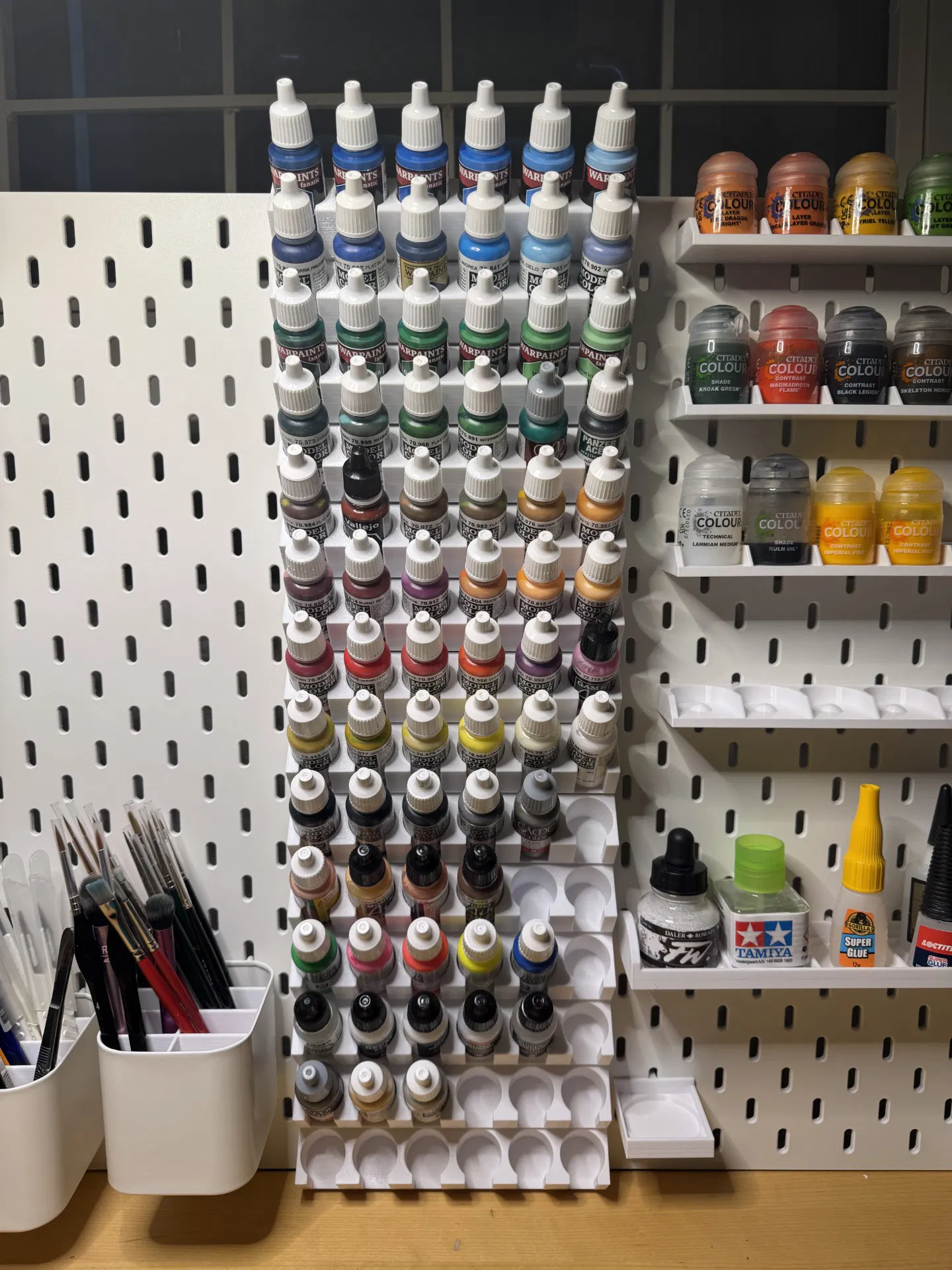 Đây là giá treo thiết kế riêng cho 6 chai sơn nhỏ giọt tiêu chuẩn, gắn trực tiếp lên bảng ghim IKEA Skadis. Phù hợp với nhiều dòng sơn phổ biến như Vallejo, Army Painter. Thiết kế không cần support, lắp đặt dễ dàng và có thể xếp chồng lên nhau.