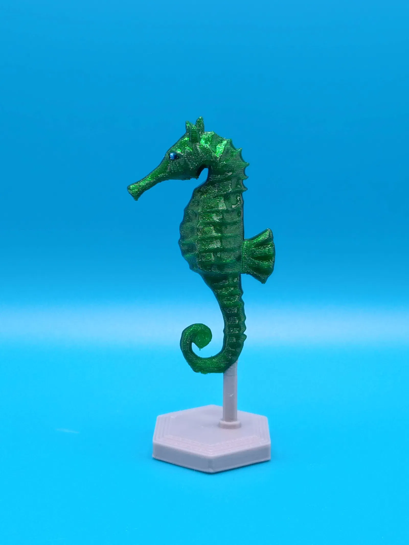 Điểm cộng lớn nhất của mẫu in này chính là thiết kế đi kèm với một chân đế vững chãi. Bạn sẽ không cần phải lo lắng về việc đặt mô hình sao cho cân bằng hay sợ nó bị đổ ngã. Chân đế hình lục giác giúp giữ cho chú cá ngựa luôn đứng thẳng, tạo sự chỉn chu và chuyên nghiệp khi trưng bày. Bạn có thể in nhiều chú cá ngựa với các loại nhựa khác nhau để tạo thành một bộ sưu tập sinh vật biển sinh động trên bàn làm việc của mình.