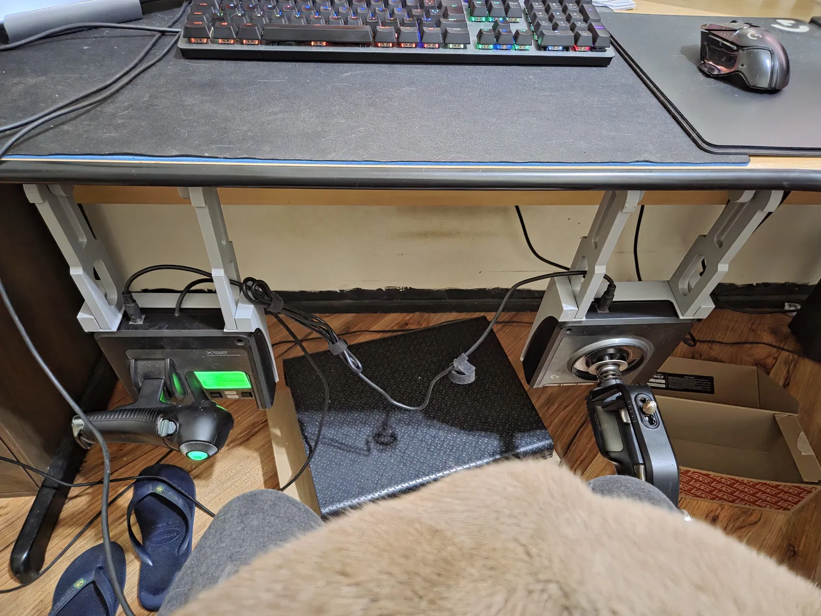 Bộ giá đỡ HOTAS in 3D hoàn chỉnh này có thể lật xuống dưới bàn khi không sử dụng. Bạn có thể in bằng nhựa PLA, cài đặt 3 lớp đáy/đỉnh và 3 đường bao (walls), với độ đặc (infill) là 25% (tôi đã dùng kiểu gyroid cho chắc chắn).