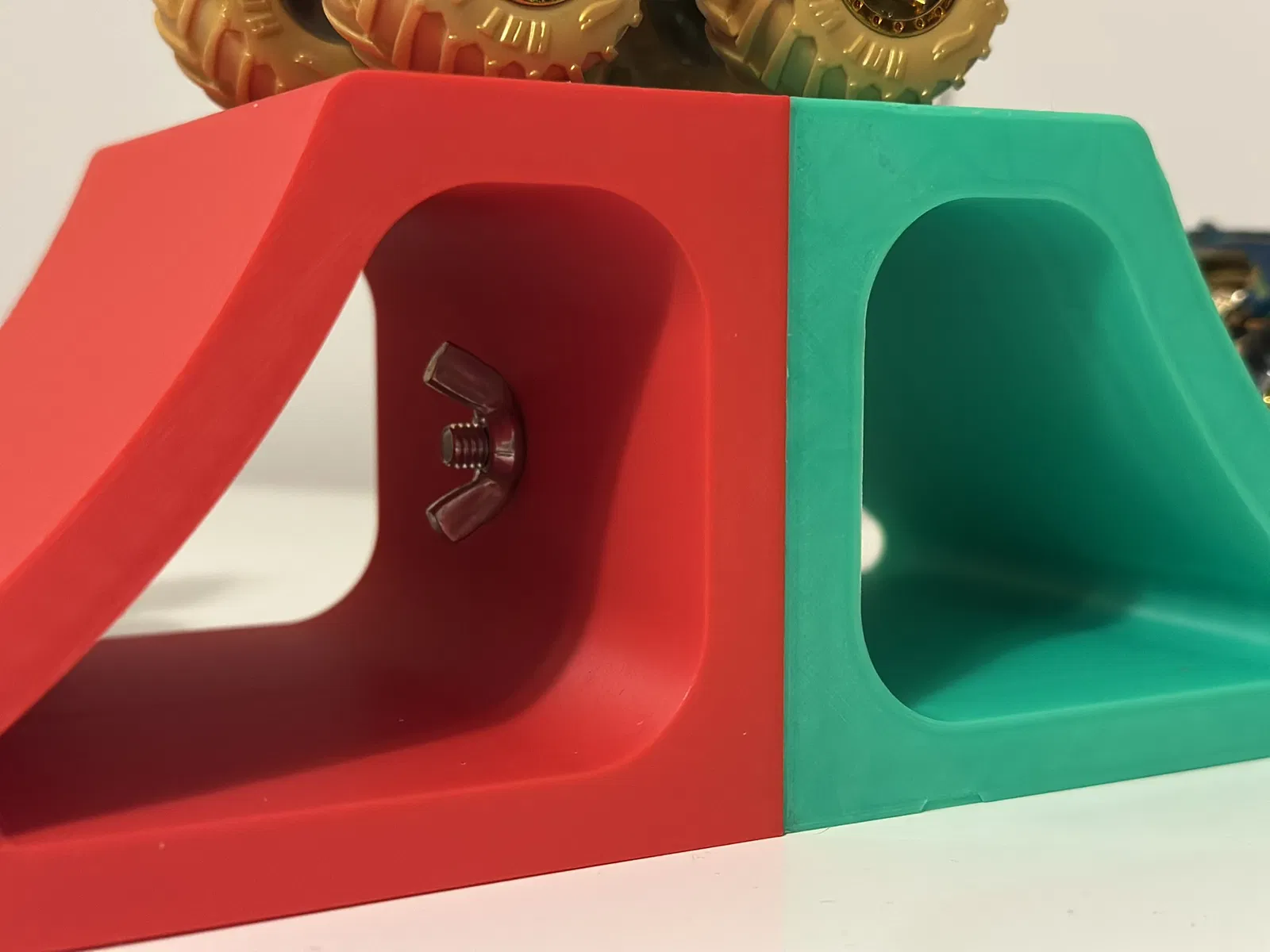 Điểm thú vị của mô hình này nằm ở tính linh hoạt cực cao trong thiết kế. Không chỉ dừng lại ở một chiếc cầu trượt đơn lẻ, bạn hoàn toàn có thể in nhiều mảnh và ghép nối chúng lại với nhau một cách dễ dàng. Nhờ vào lỗ khoan sẵn ở thân cầu, bạn chỉ cần dùng một chiếc bu-lông và đai ốc tai hồng (wing nut) là đã có thể cố định hai mảnh lại, tạo thành một chiếc bàn hoặc một bệ đỡ vững chãi cho xe. Sự sáng tạo là không giới hạn, bạn có thể nối dài đường đua hoặc tạo ra các cấu trúc phức tạp hơn tùy ý.