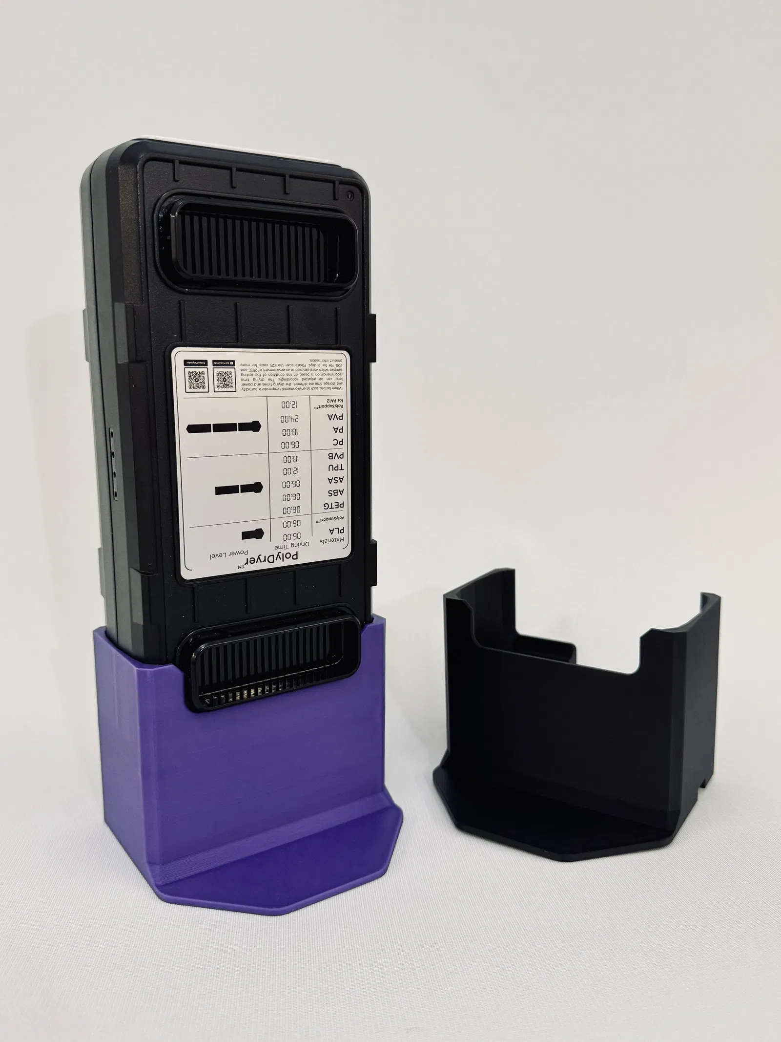 Cái đế này giúp bạn đặt các thiết bị PolyDryer theo chiều dọc bên trong tủ máy in để làm bộ phận sưởi ấm buồng in. Hướng đặt đứng này giữ cho màn hình LCD luôn hiển thị rõ, có các khoảng hở bên dưới để cắm dây cáp và thao tác công tắc nguồn, đồng thời tích hợp đường đi dây để việc quản lý cáp trông gọn gàng hơn.