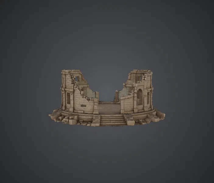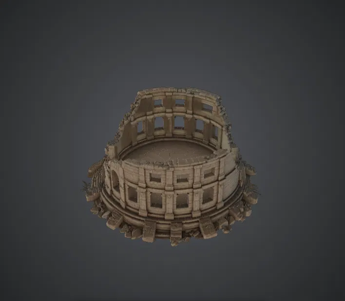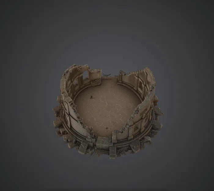 Mô hình địa hình đấu trường đá đổ nát với các chi tiết tường gãy và bậc thang cổ kính. Thiết kế dạng bán nguyệt đa năng, phù hợp cho game tabletop và dễ dàng in ấn trên máy in resin hoặc FDM.